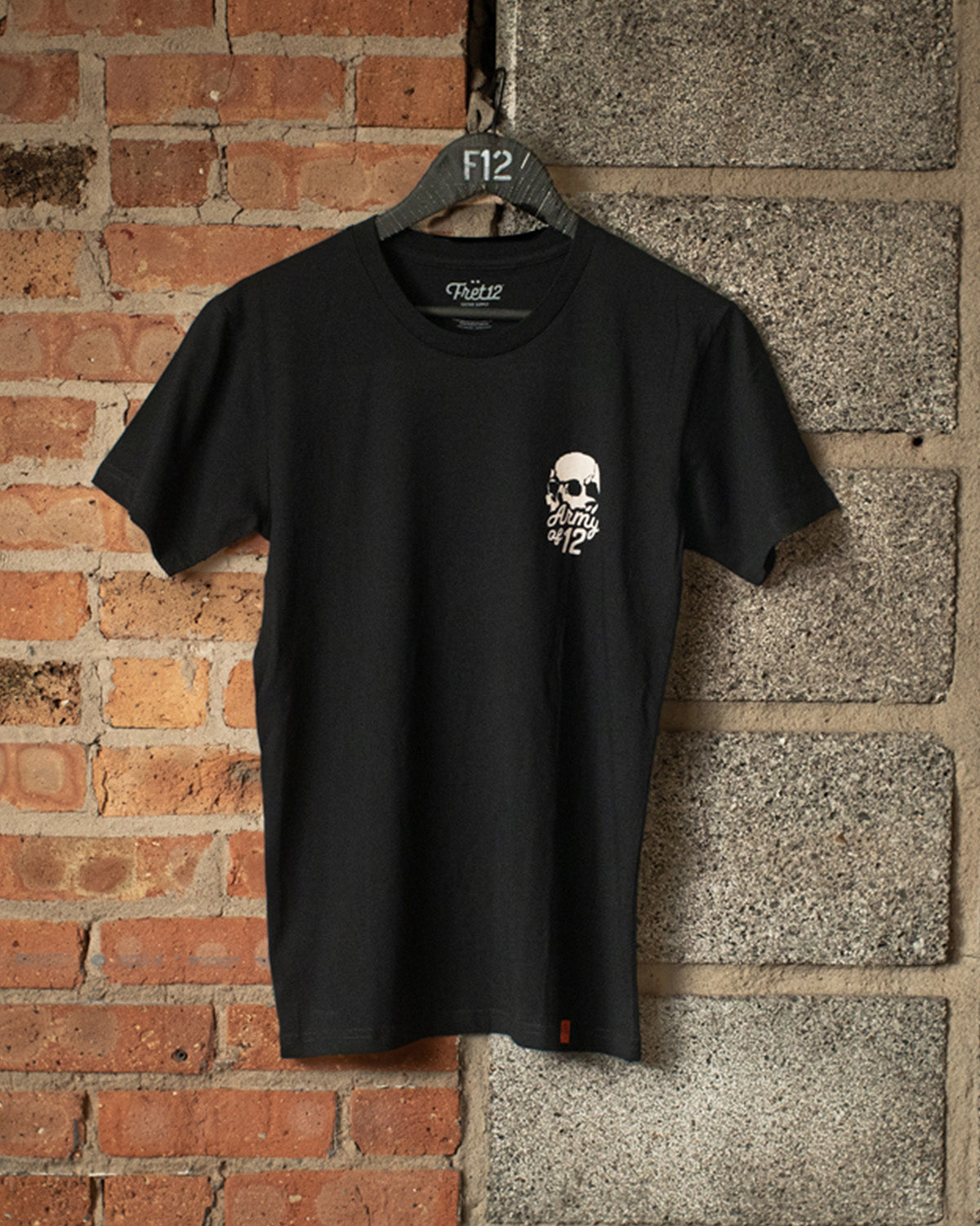 Launched in 2012, the Army of 12 is the home base for tens of thousands of passionate music fans. This new-for-2021 design re-imagines this old-school FRET12 classic. Mid-weight cotton tee in black and white.