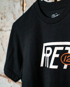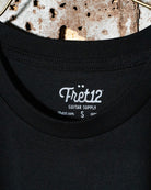 Inspired by vintage roadsters and classic racing graphics, we've souped up this black FRET12 tee with our sharp new racer logo. It's a sleeker, sportier look for those who like to step on it — whether it's the gas pedal or the gain box. Time to get in the driver's seat, pop in that road trip mix, and crank the volume to 12.