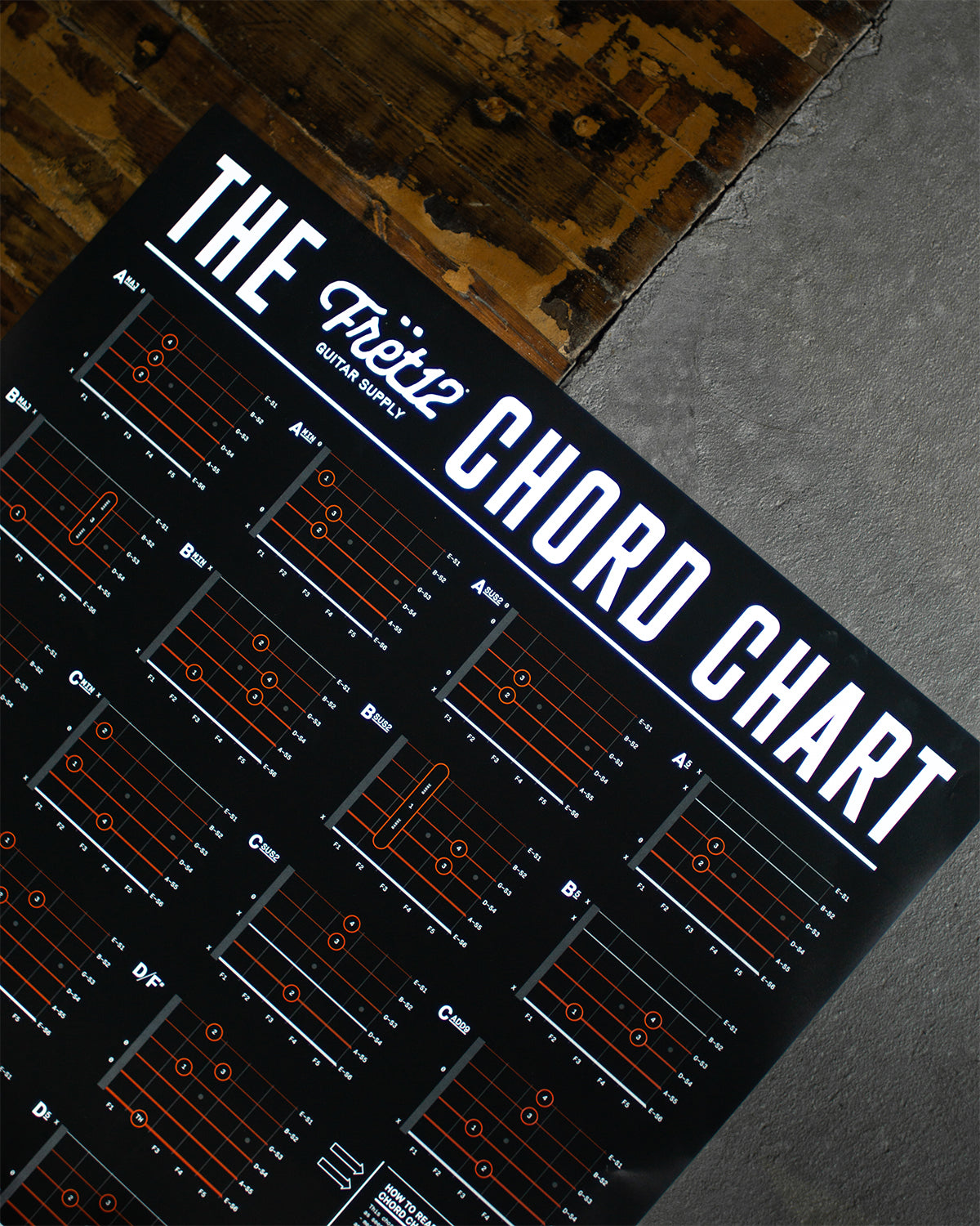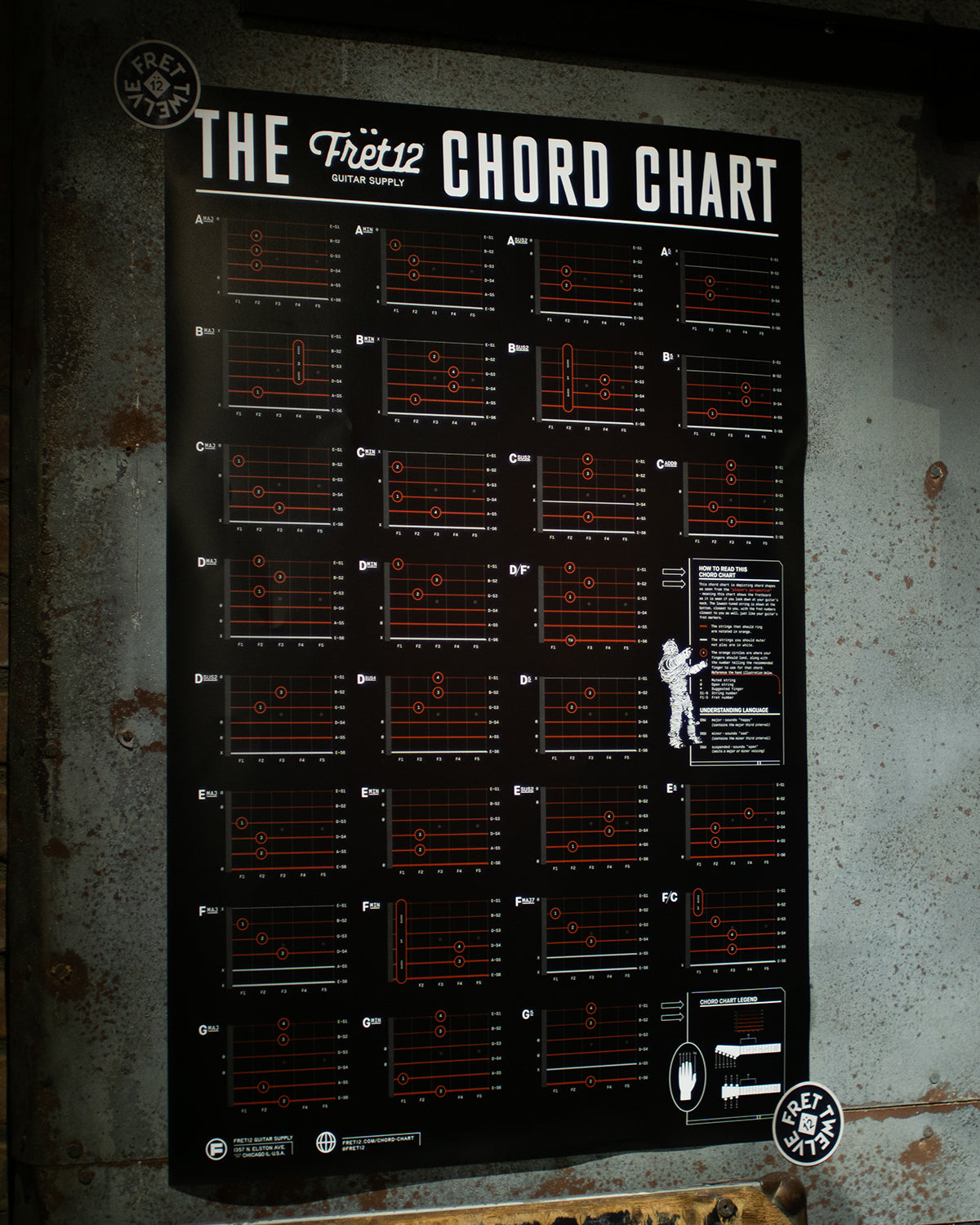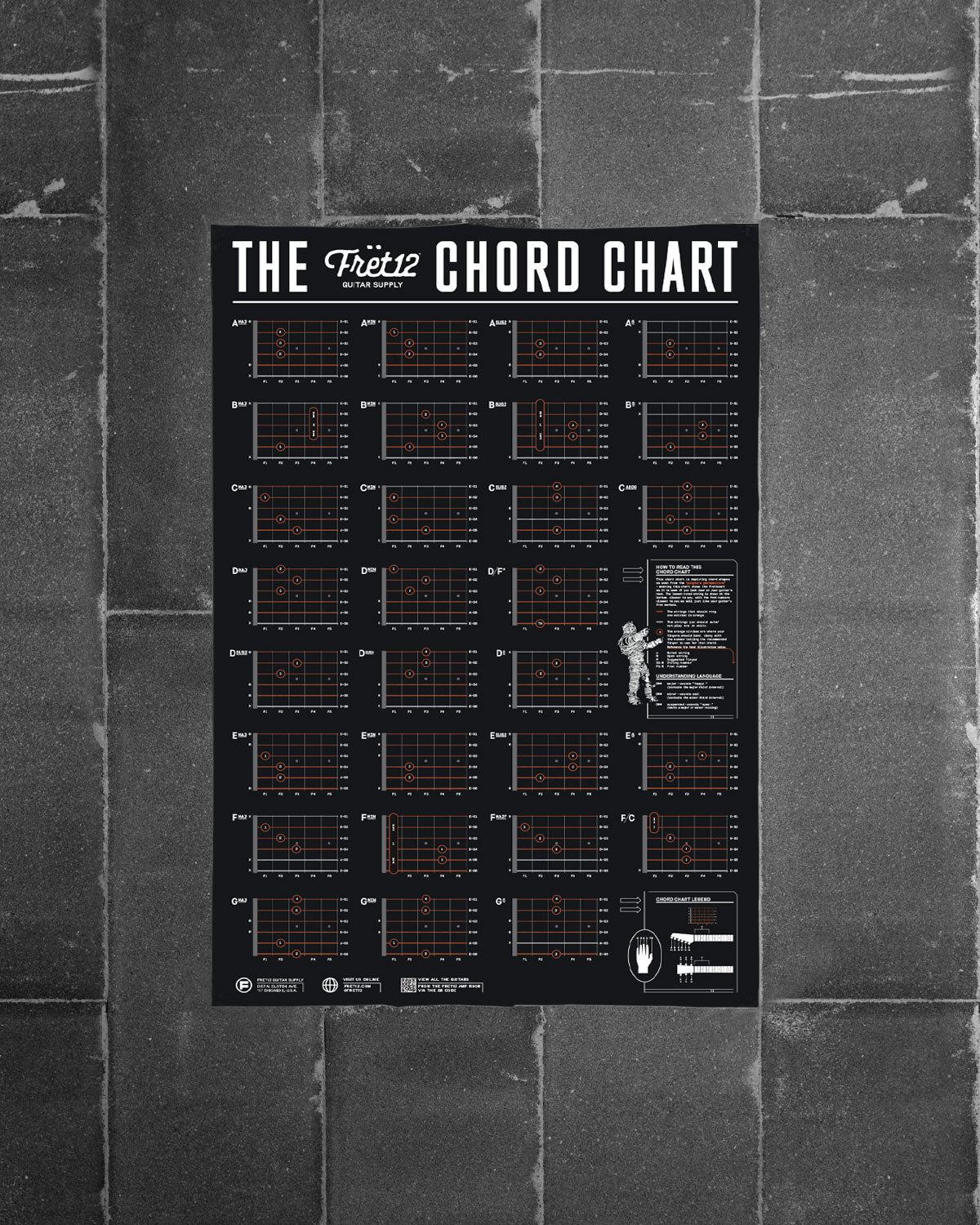 We've laid out the most popular hand positions and finger assignments to create a guitar chord chart that makes a perfect gift for those just starting their 6 string musical journey all the way to those looking to get some basic chord theory on the wall of their jam space.