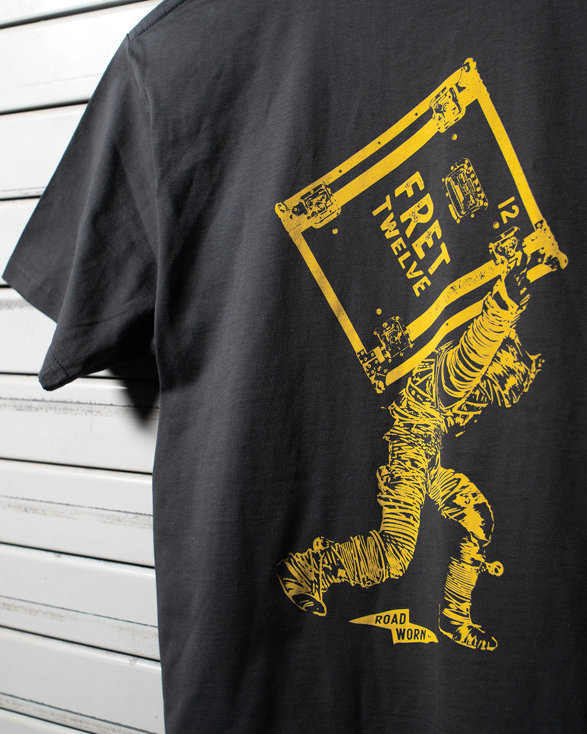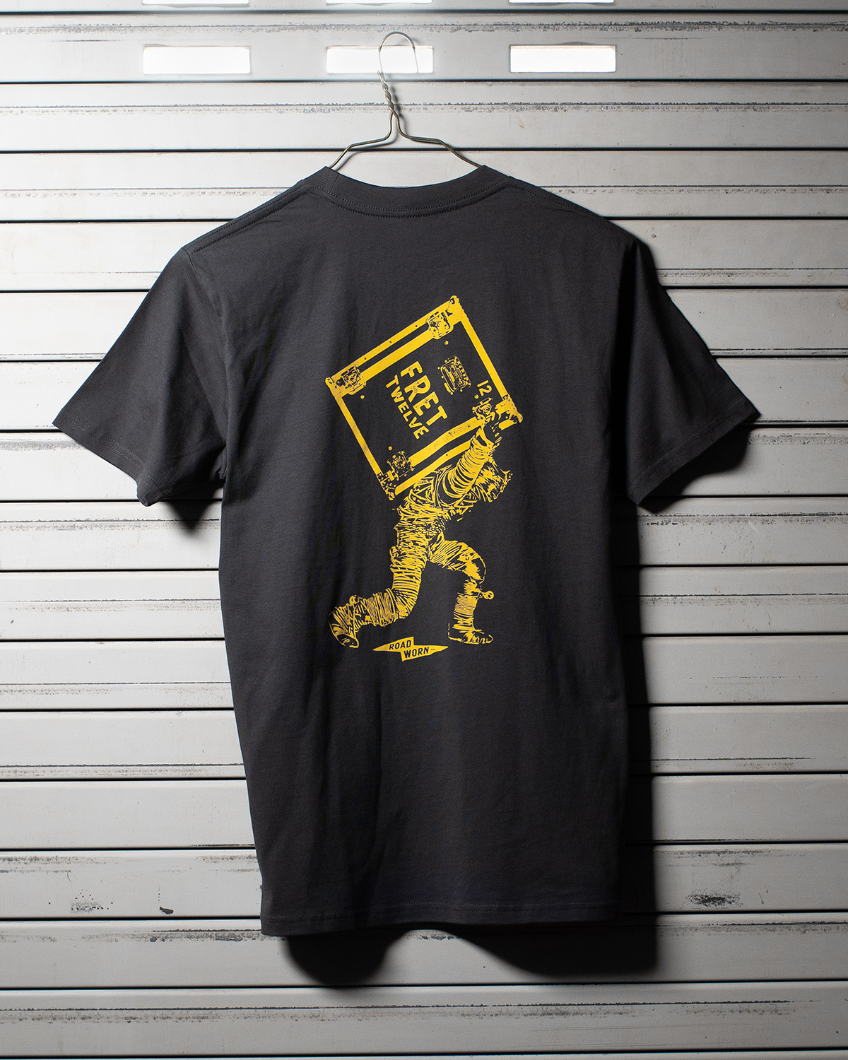 Our muscled mascot knows a thing or two about carting the gear that keeps rock n' roll alive! Wheels? Where he's going, he won't need wheels. Designed for techs, this heavyweight tee is crafted for life on the road.