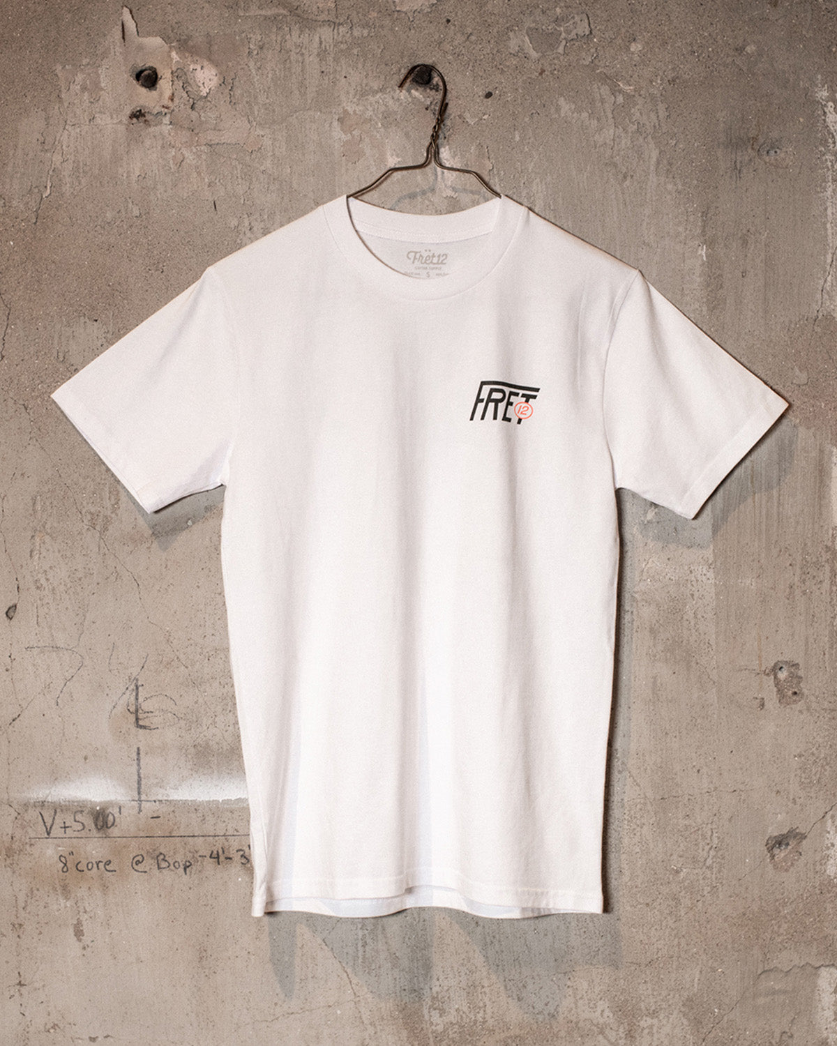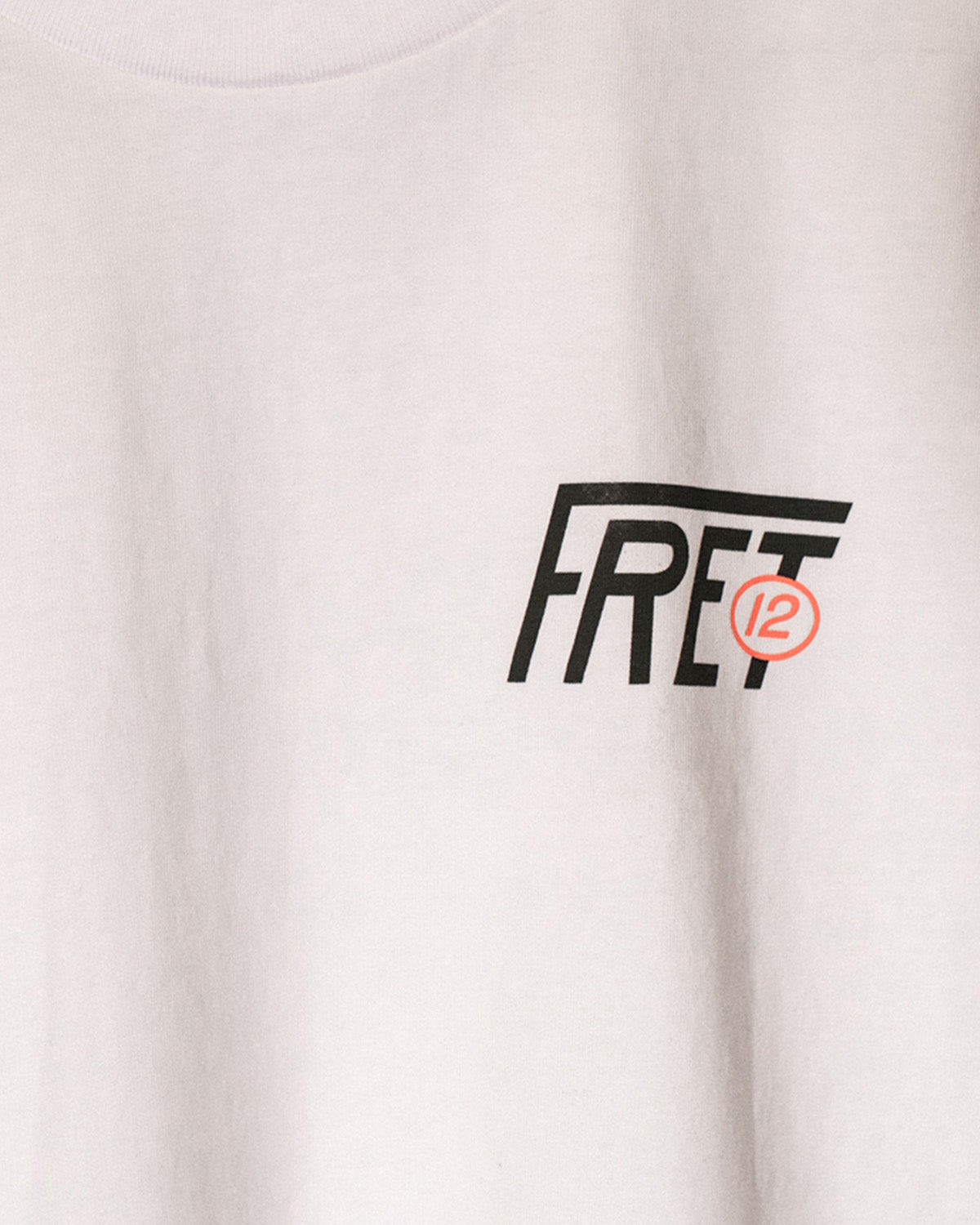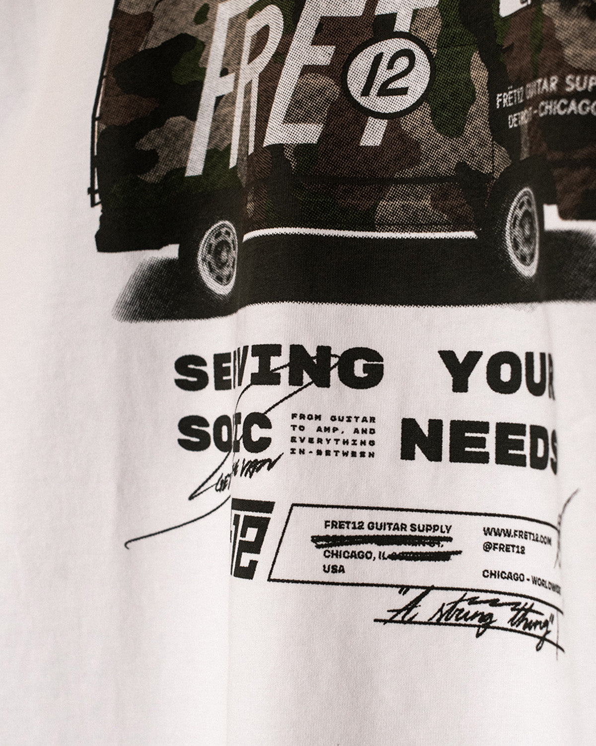 Inspired by vintage roadsters and classic racing graphics, we've souped up this white FRET12 tee with our sharp racer logo and camo van. It's a sleeker, sportier look for those who like to step on it — whether it's the gas pedal or the gain box. Time to get in the driver's seat, pop in that road trip mix, and crank the volume to 12.