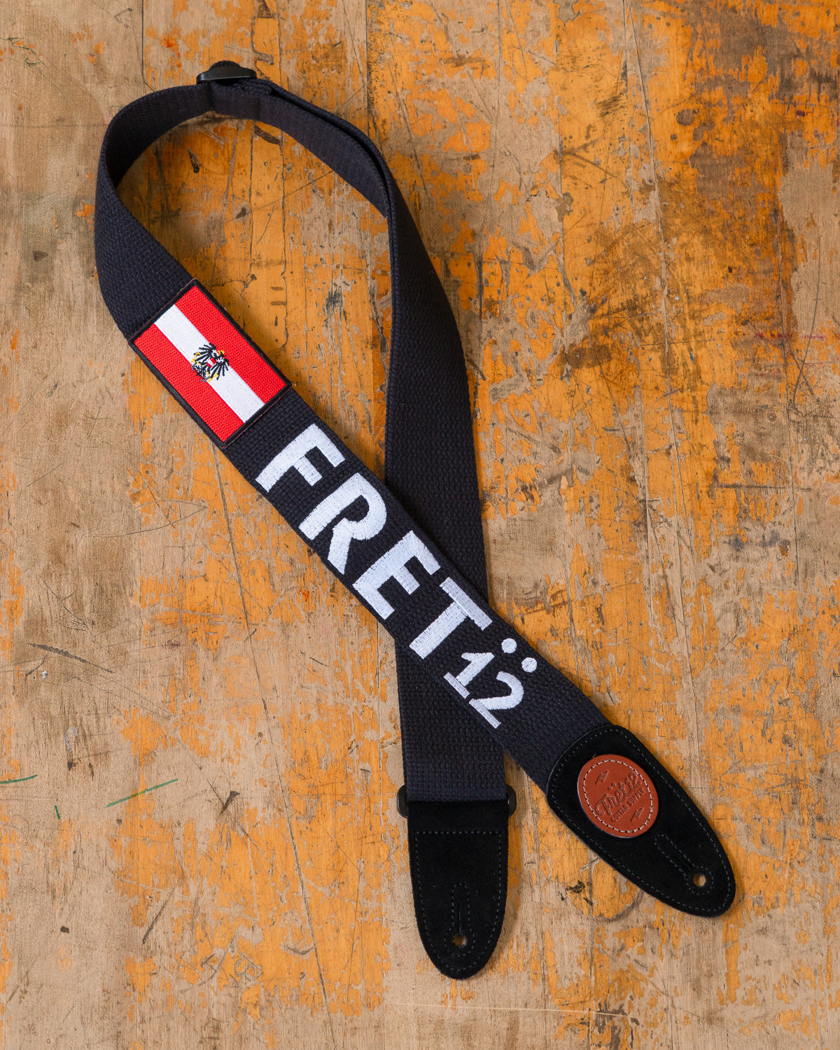 Embroidered FRET12 Block Logo Guitar Strap in black, with a woven Austria (Österreich) Flag badge.