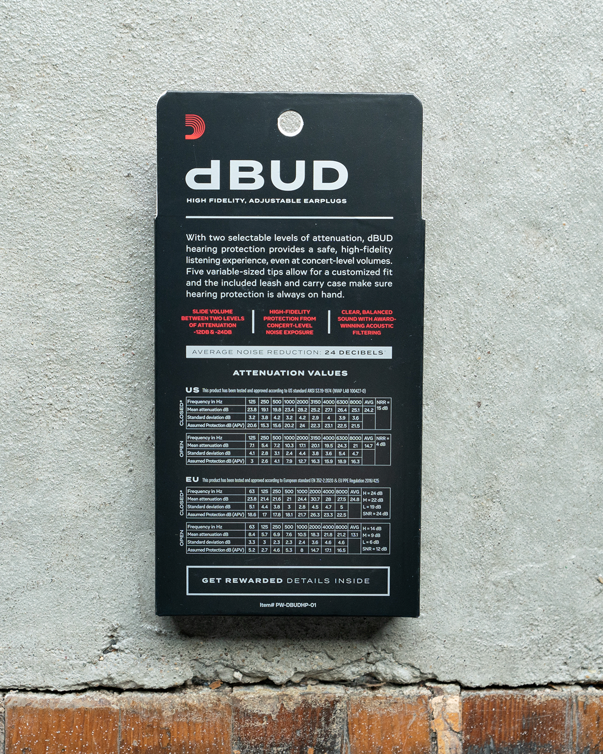 With two selectable levels of attenuation, -12dB and -24dB, dBud hearing protection provides a safe, high-fidelity listening experience, even at levels over 100dbs. Five variable sized tips allow for a customized fit, while the included leash and carry case make sure protection is always on hand for the musician or music enthusiast on-the-go. dBuds give you customized hearing protection without compromise.