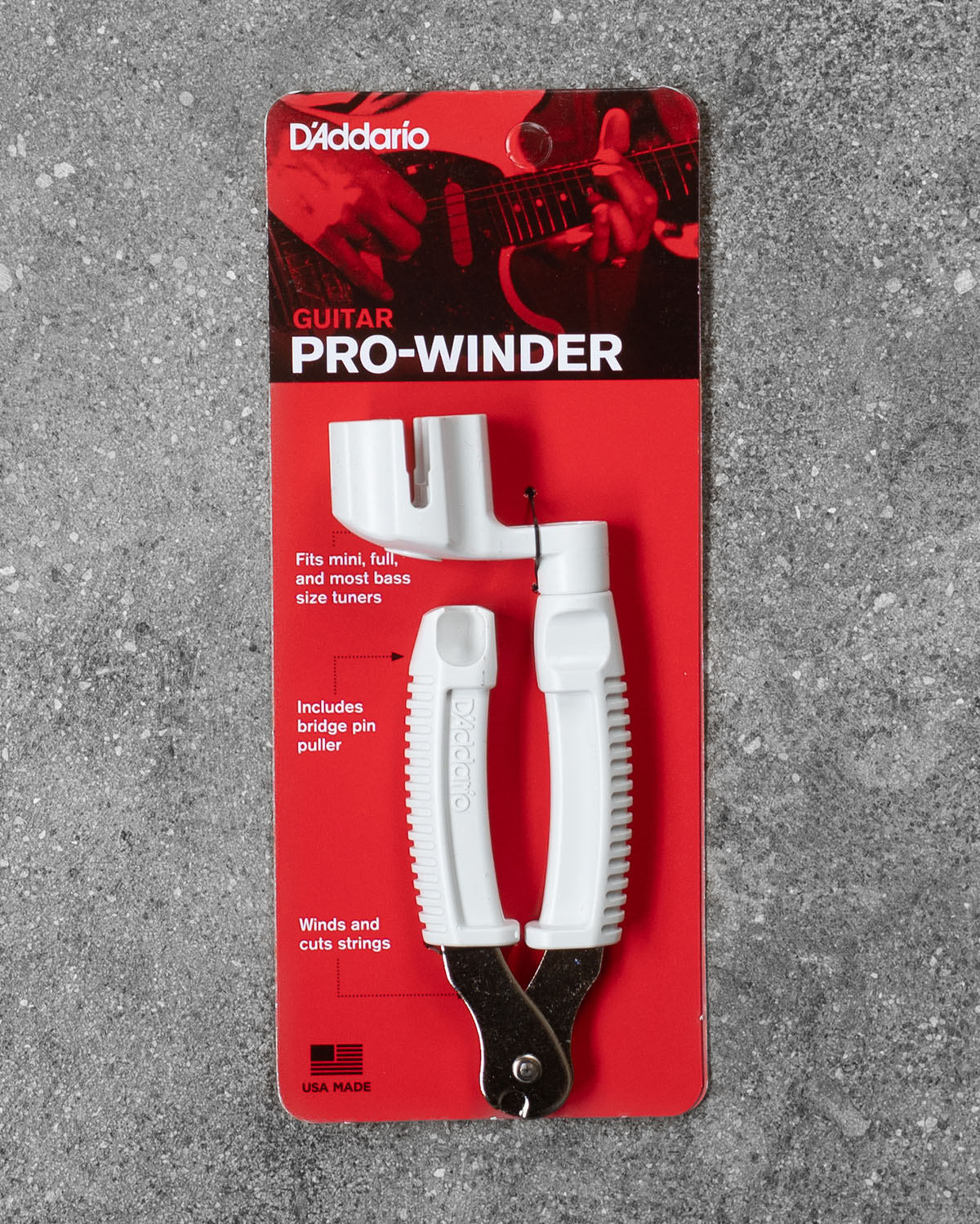 Pro-Winder is a high-quality string winder with a built-in clipper and bridge pin puller. The Pro-Winder is designed to fit virtually all guitars, banjos, ukuleles, and mandolins. Ergonomically designed with durable hardened steel wire cutters, the Pro-Winder string winder is the ultimate all-in-one restringing tool.
