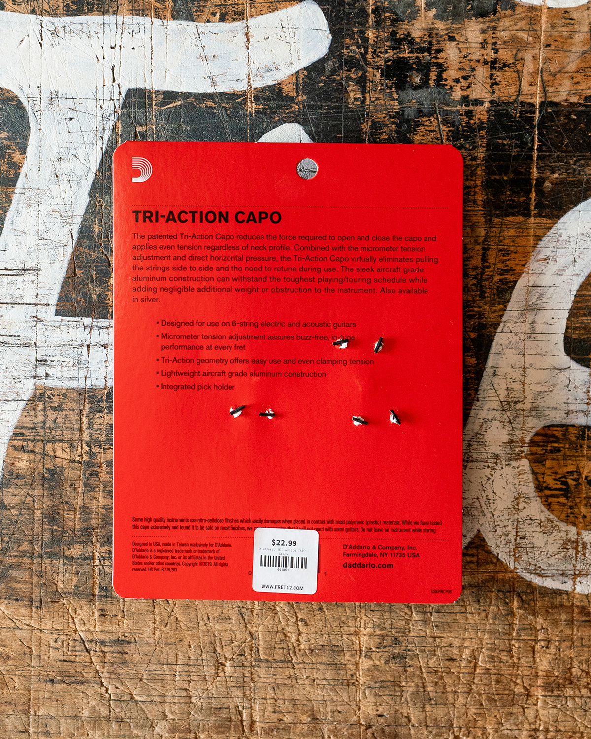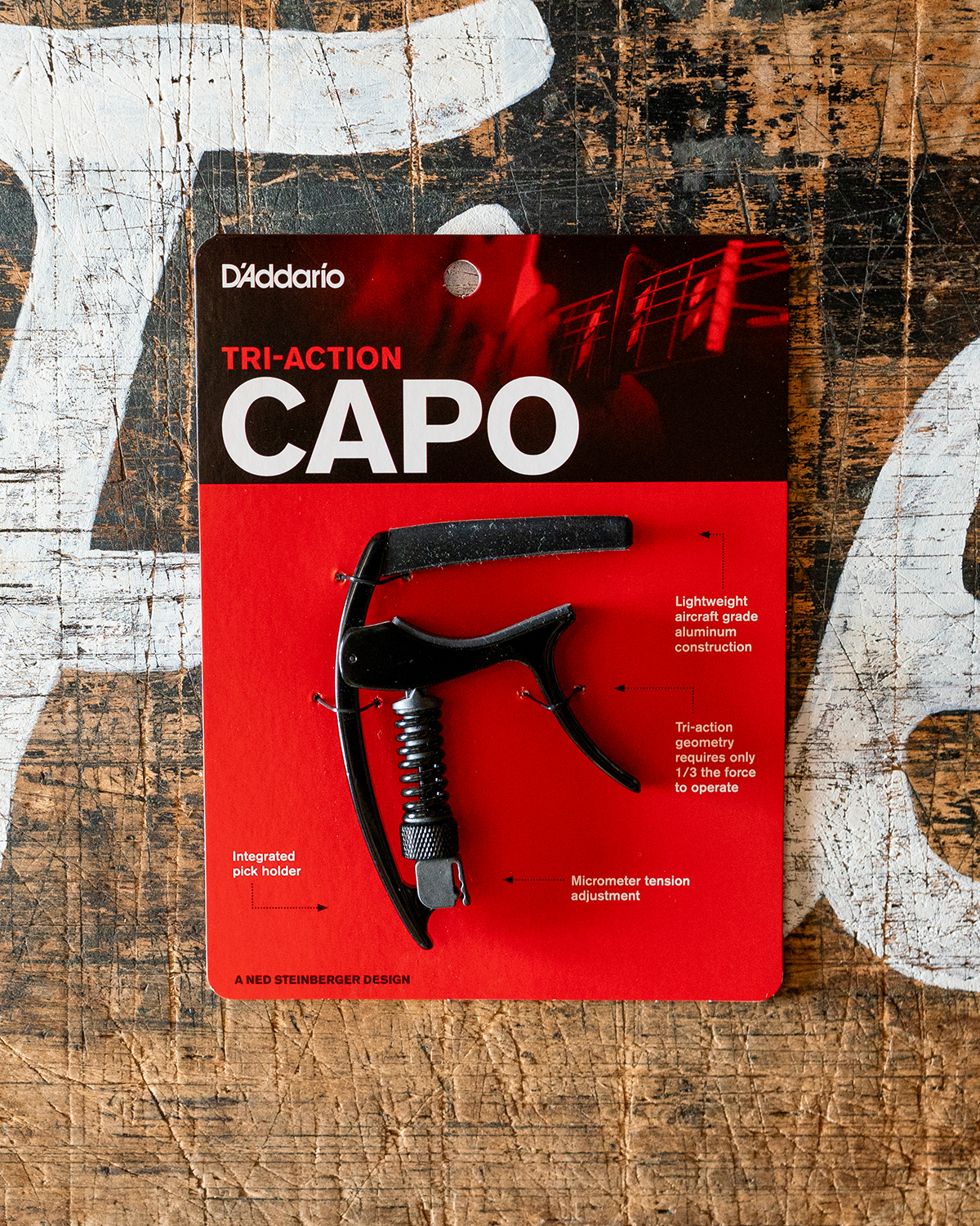 The Tri-Action capo assures buzz-free, in tune performance at any fret. The patented Tri-Action geometry reduces the force required to open and close the capo and applies even tension regardless of neck profile. Combined with the micrometer tension adjustment and direct horizontal pressure, the Tri-Action Capo virtually eliminates pulling the strings side to side and the need to retune during use. Additionally, the lightweight aluminum construction adds negligible weight to the neck of the instrument. The capo features an integrated pick holder. Designed in collaboration with Ned Steinberger - US Pat. 8,779,262