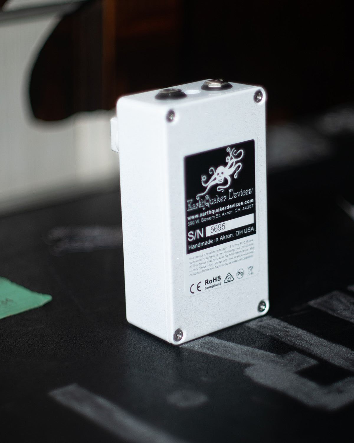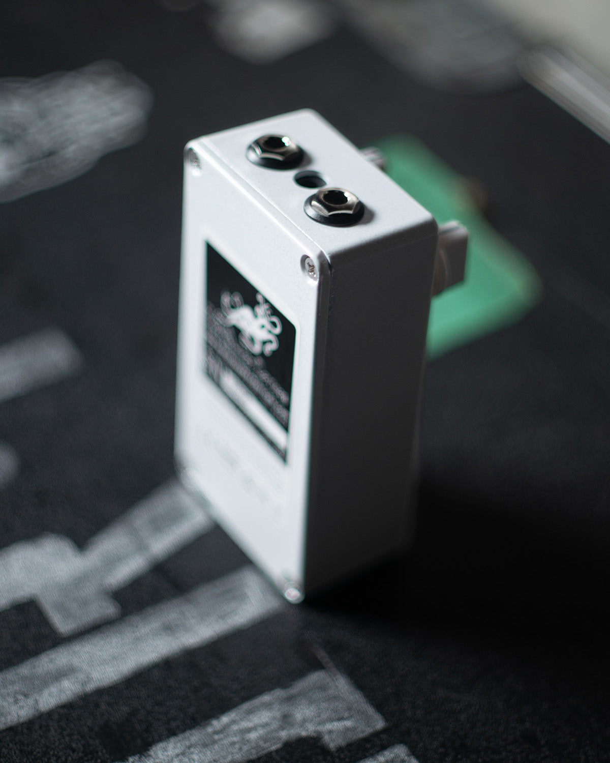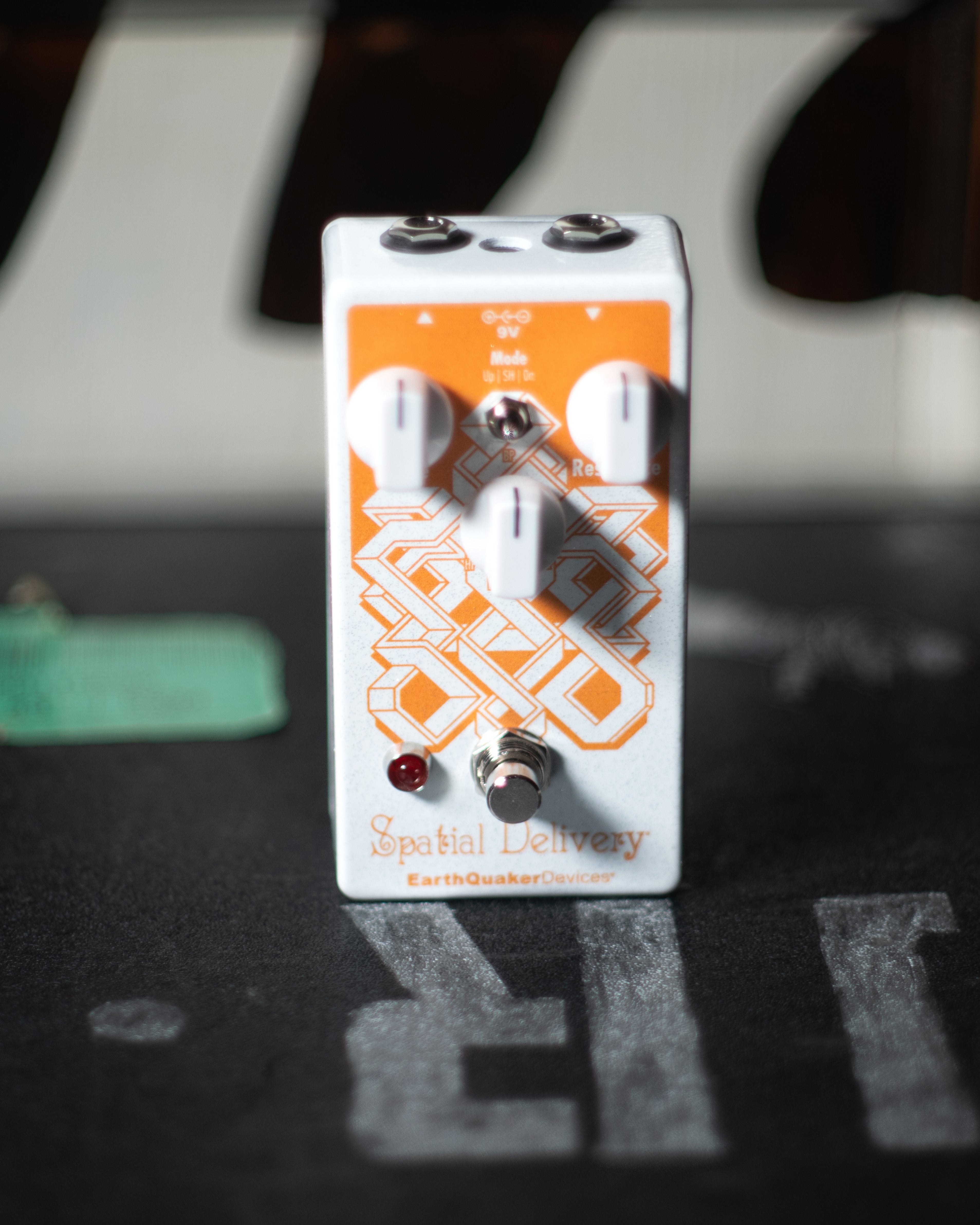With Range, Resonance and Filter controls you can get super emphasized filter sweeps in the Up and Down modes. The Range, in combination with pick attack, controls the sensitivity and reaction time of the envelope and thus the width of the frequency sweep. The higher the Range and harder the attack equals a faster reaction time and higher frequency sweep and vice versa. Reign in the controls a bit, add your favorite overdrive/fuzz after the Spatial Delivery and you’ve got a real nice resonant, cut-through-the-mix lead tone. Crank the controls back up and you’re a neo-bedroom rock god. In the Sample and Hold mode the filter is controlled by random voltage and the Range controls the speed. Add a sub octave into the mix (before or after) and you’ve just created a deep fried space droid computer freak-out. The filter can be cross faded between high pass (counterclockwise), band pass (center) and low pass (clockwise) for a wide variety of voices. The Resonance control goes from zero to the brink of oscillation and adds more body and ring to the filter voice.