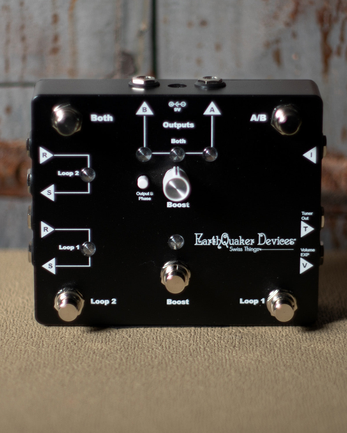 Swiss Things® combines two true-bypass Flexi-Switch® enabled effects loops, a Flexi-Switch® AB-Y box with transformer isolation between outputs, a buffered tuner output, 20dB of clean boost with adjustable gain, an expression pedal output for volume control and a quiet, high headroom output buffer into a compact pedalboard-friendly signal routing junction box that lives at the top-right corner of your pedalboard and really ties your rig together without any signal loss.