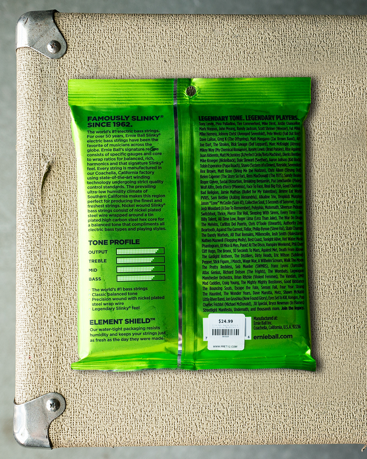 Ernie Ball Nickel Wound Electric Bass Strings are made from nickel plated steel wrapped around a hex shaped steel core wire. Each bass guitar string produces a bright, balanced tone and is manufactured with the finest and freshest raw materials in the beautiful Coachella Valley of Southern California.