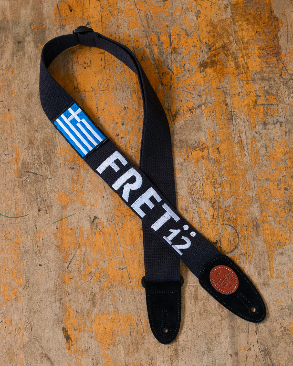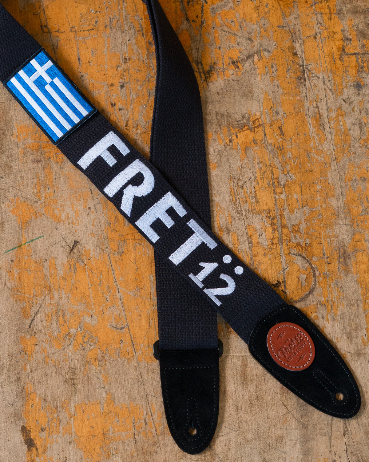 Embroidered FRET12 Block Logo Guitar Strap in black, with a woven Greece (Ελλάδα) Flag badge.