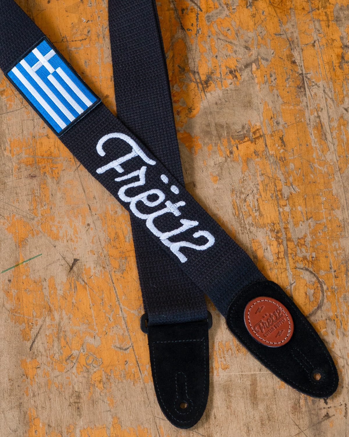 Embroidered FRET12 Script Logo Guitar Strap in black, with a woven Greece (Ελλάδα) Flag badge.
