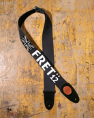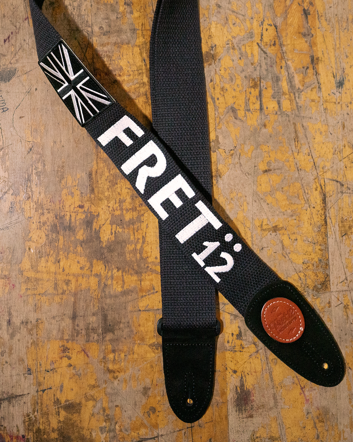 Embroidered FRET12 Block Logo Guitar Strap in black, with a woven Monochrome British Flag badge.
