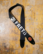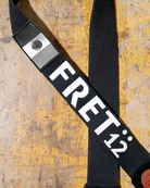 The classic FRET12 Logo Guitar Strap in black, with a monochrome Mexican Flag badge.