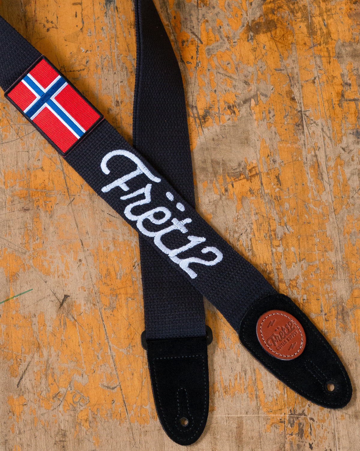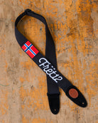 Embroidered FRET12 Script Logo Guitar Strap in black, with a woven Norway (Norge) Flag badge.
