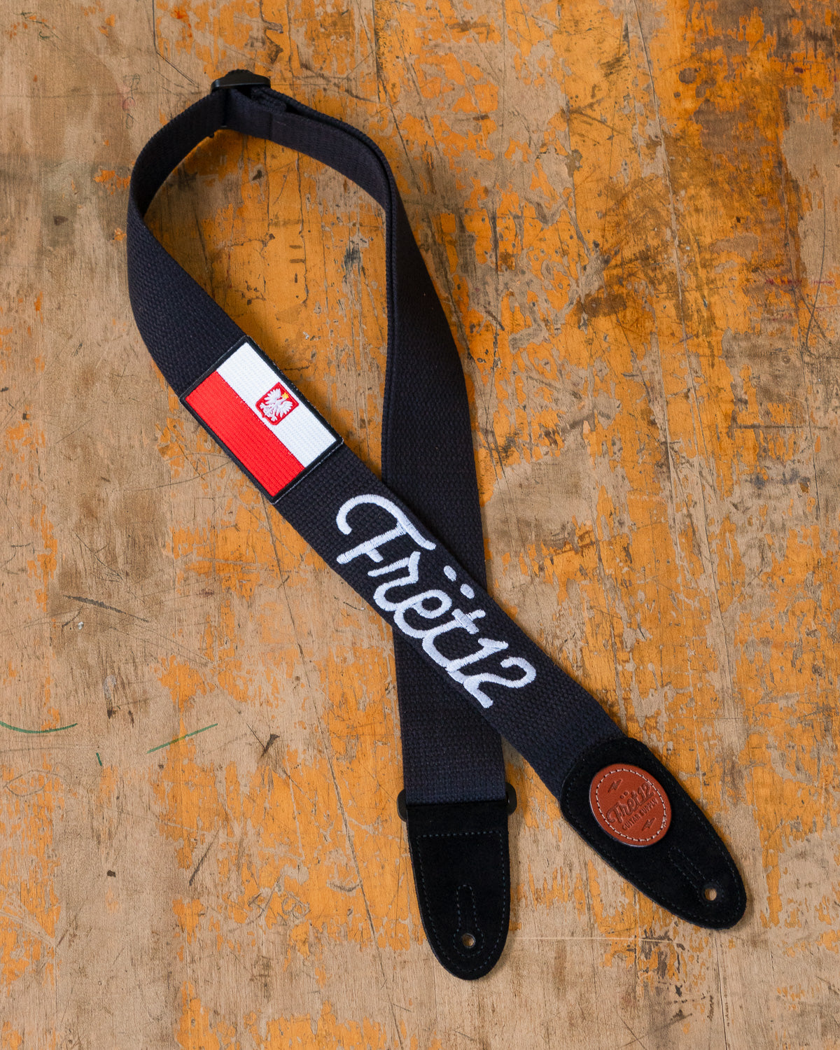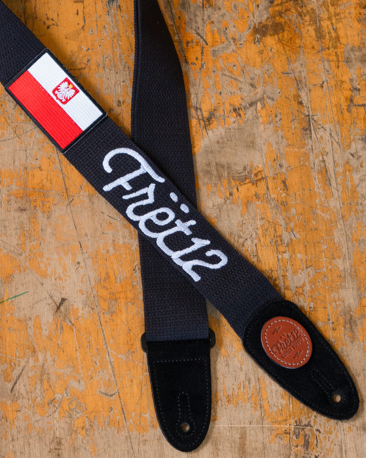 Embroidered FRET12 Script Logo Guitar Strap in black, with a woven Poland (Polska) Flag badge.