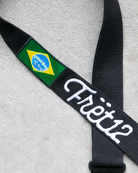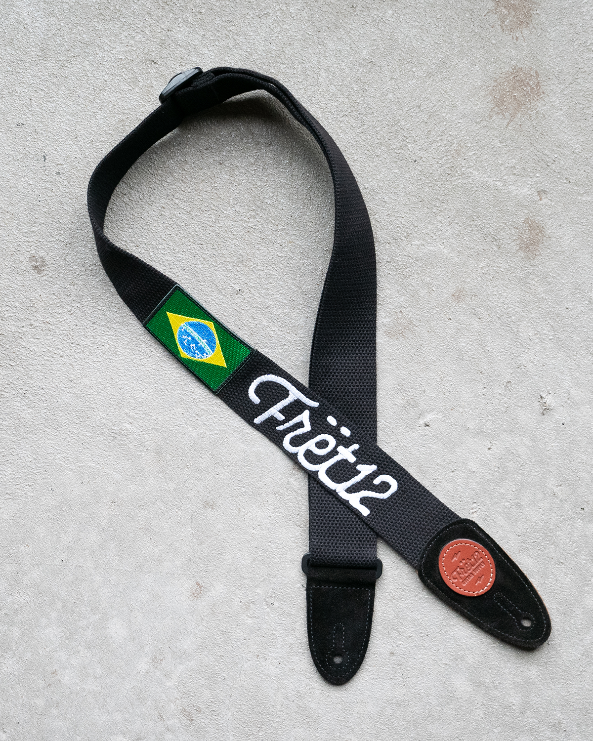 The FRET12 Script Logo Guitar Strap in black, with a Brazil (Brasil) Flag badge.