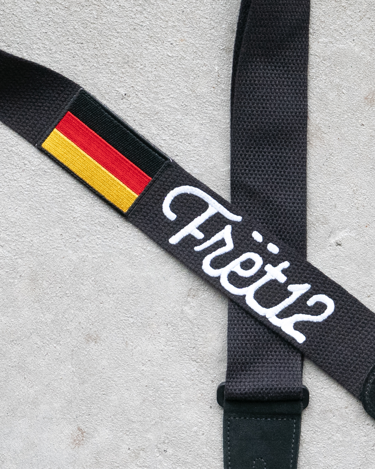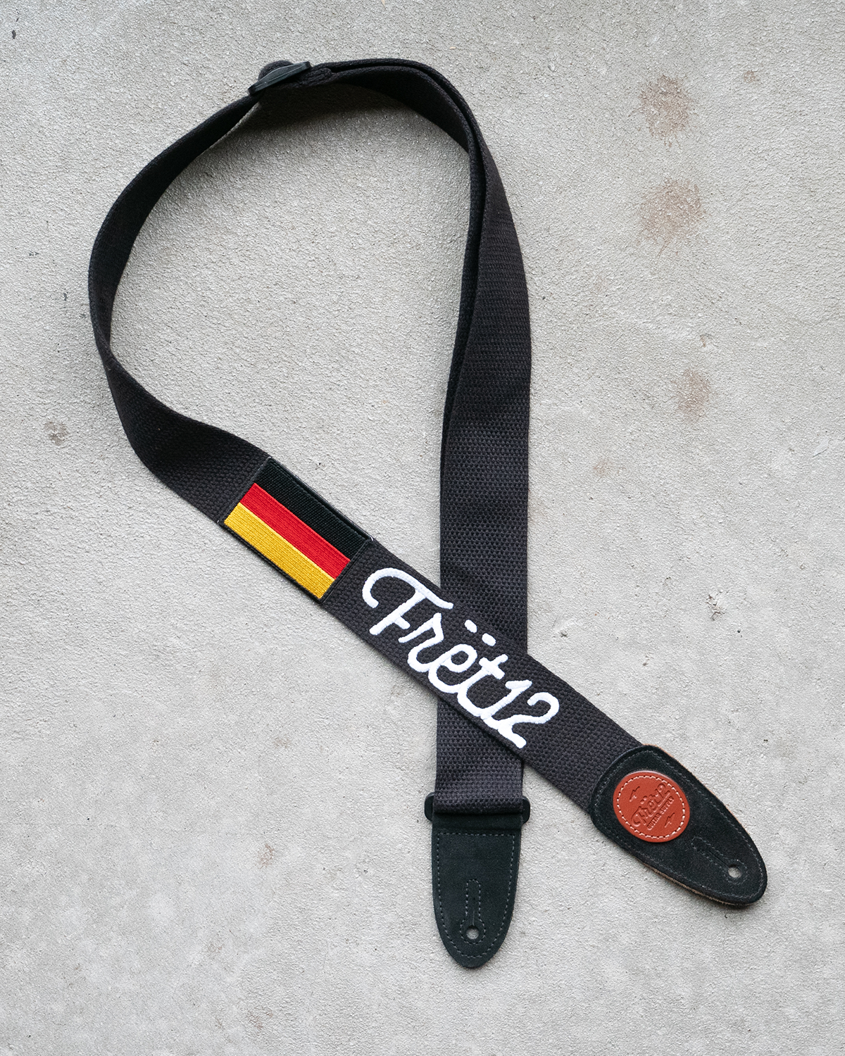 The FRET12 Script Logo Guitar Strap in black, with a Germany (Deutschland) Flag badge.