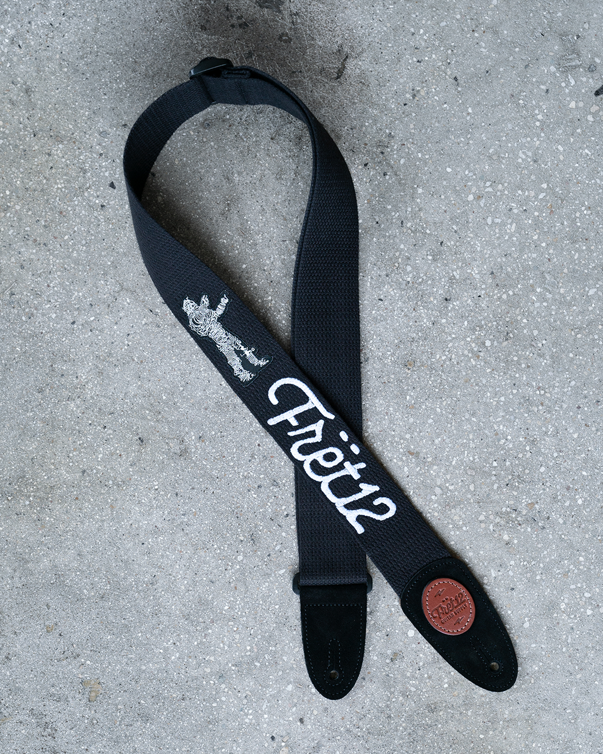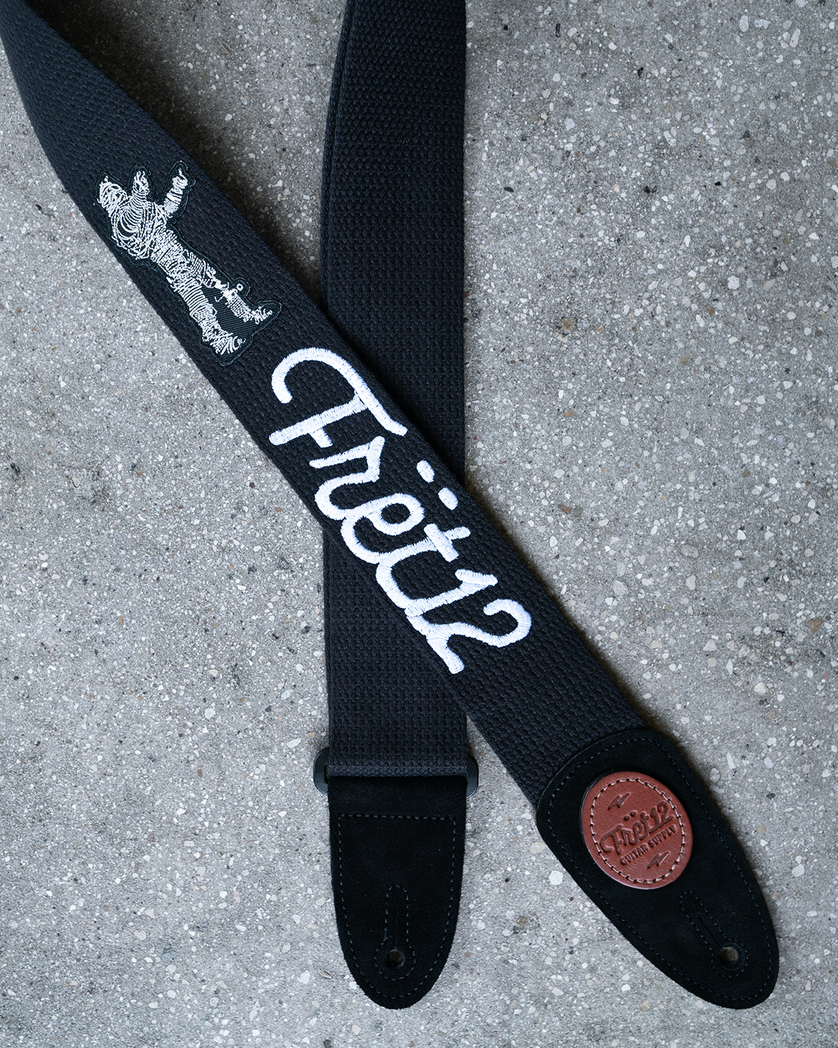 Embroidered FRET12 Script Logo Guitar Strap in black, with a woven String Thing badge.
