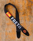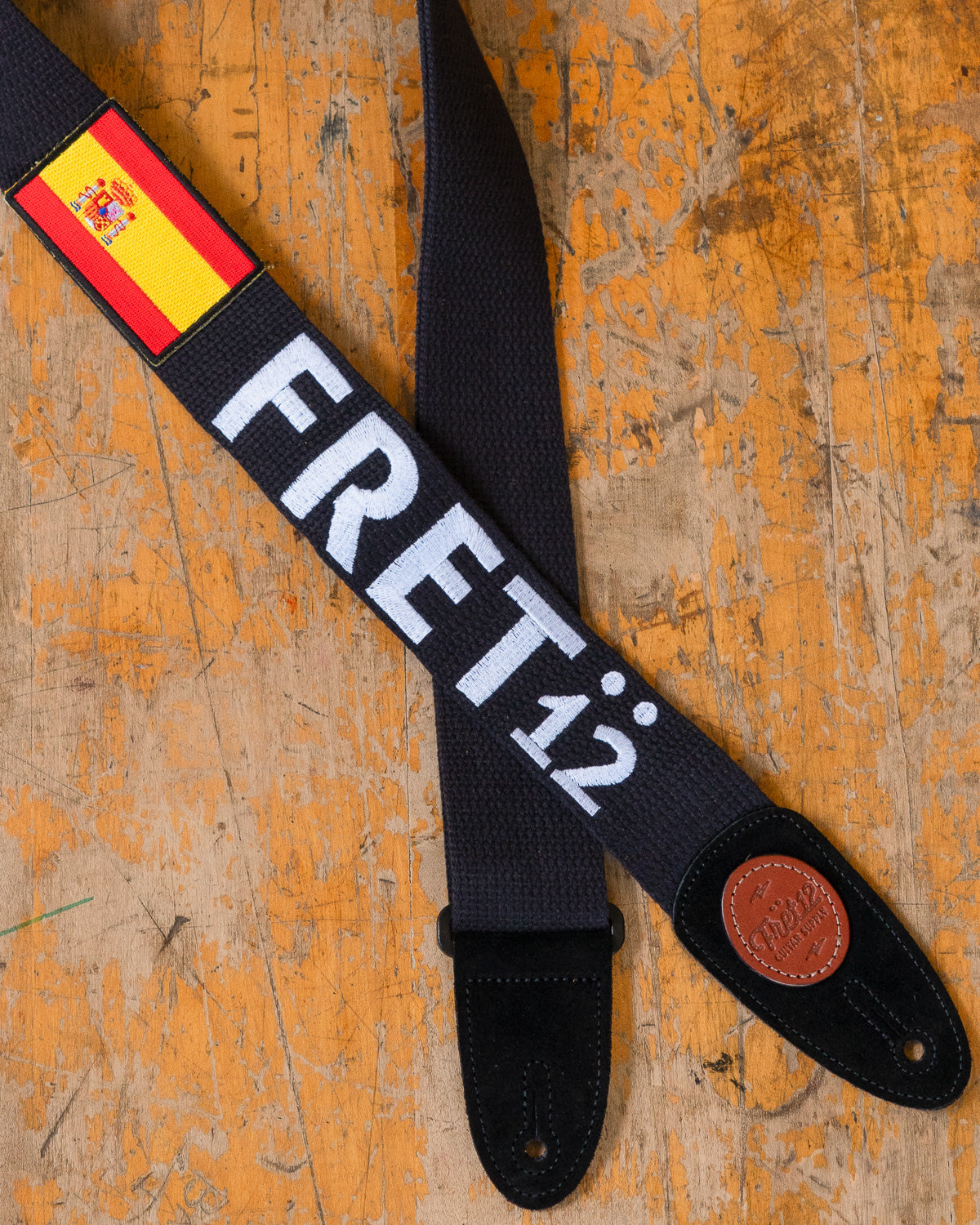 Embroidered FRET12 Block Logo Guitar Strap in black, with a woven Spain (España) Flag badge.