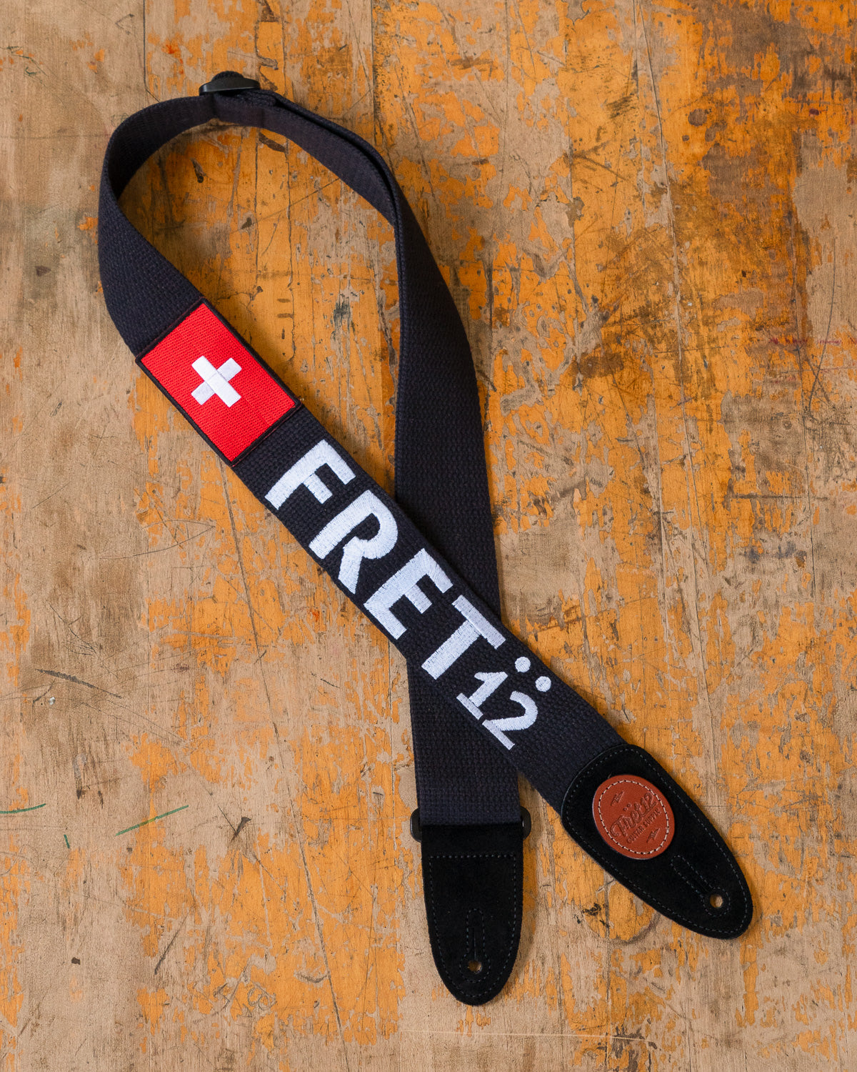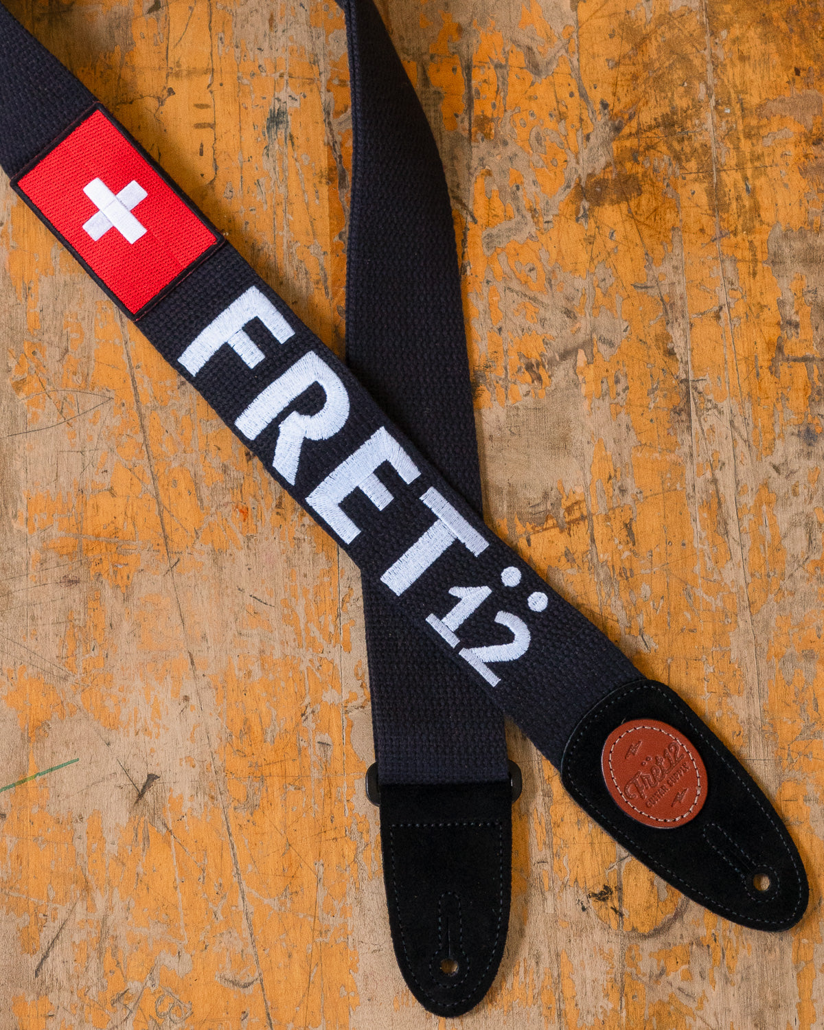 Embroidered FRET12 Block Logo Guitar Strap in black, with a woven Switzerland Flag badge.