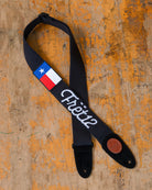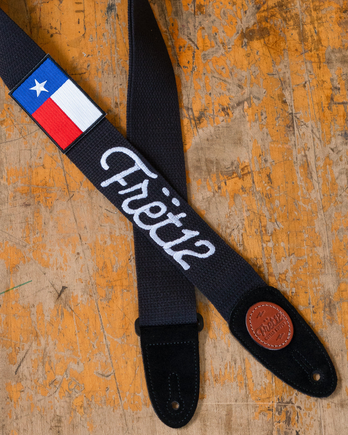 Embroidered FRET12 Script Logo Guitar Strap in black, with a woven Texas Flag badge.
