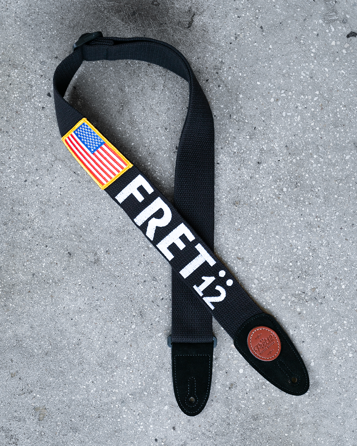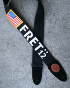 Embroidered FRET12 Block Logo Guitar Strap in black, with a woven American Flag badge.