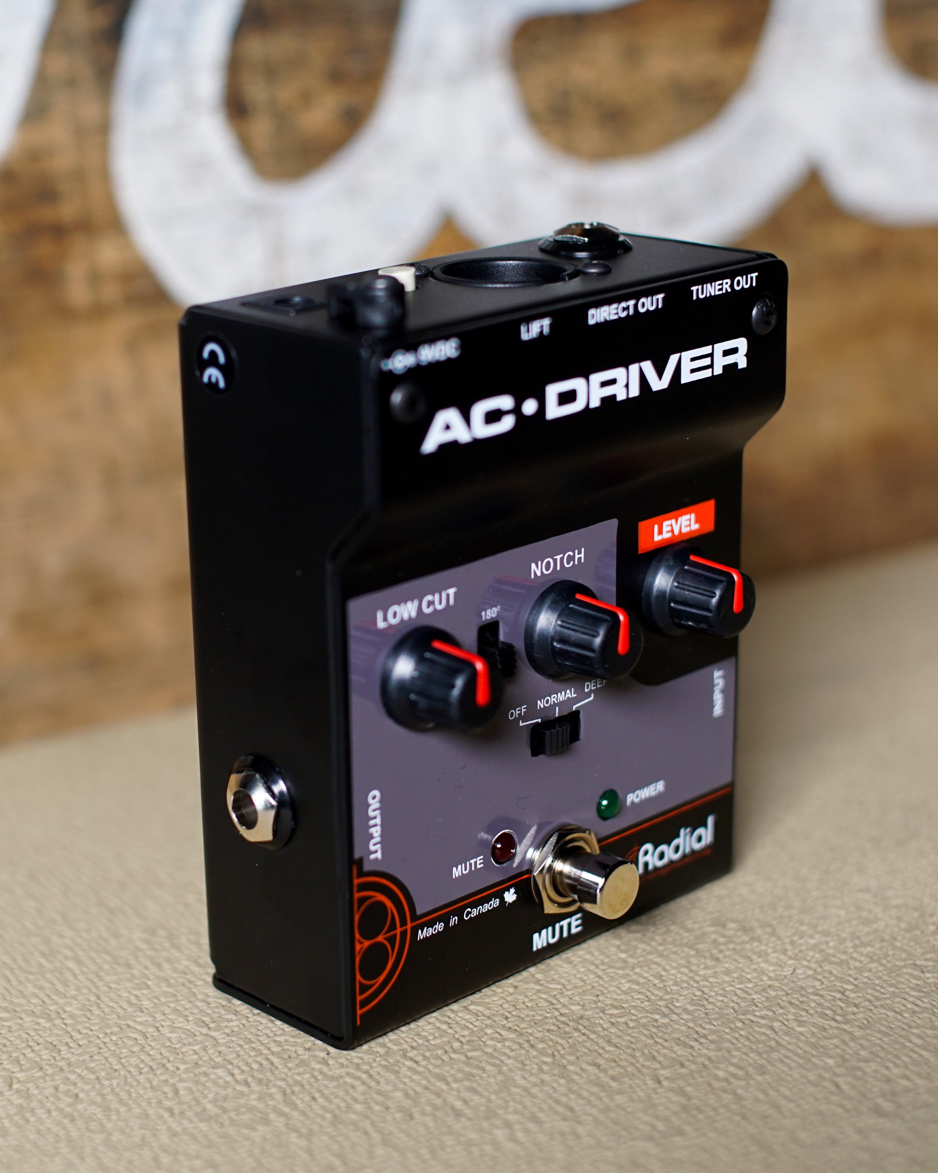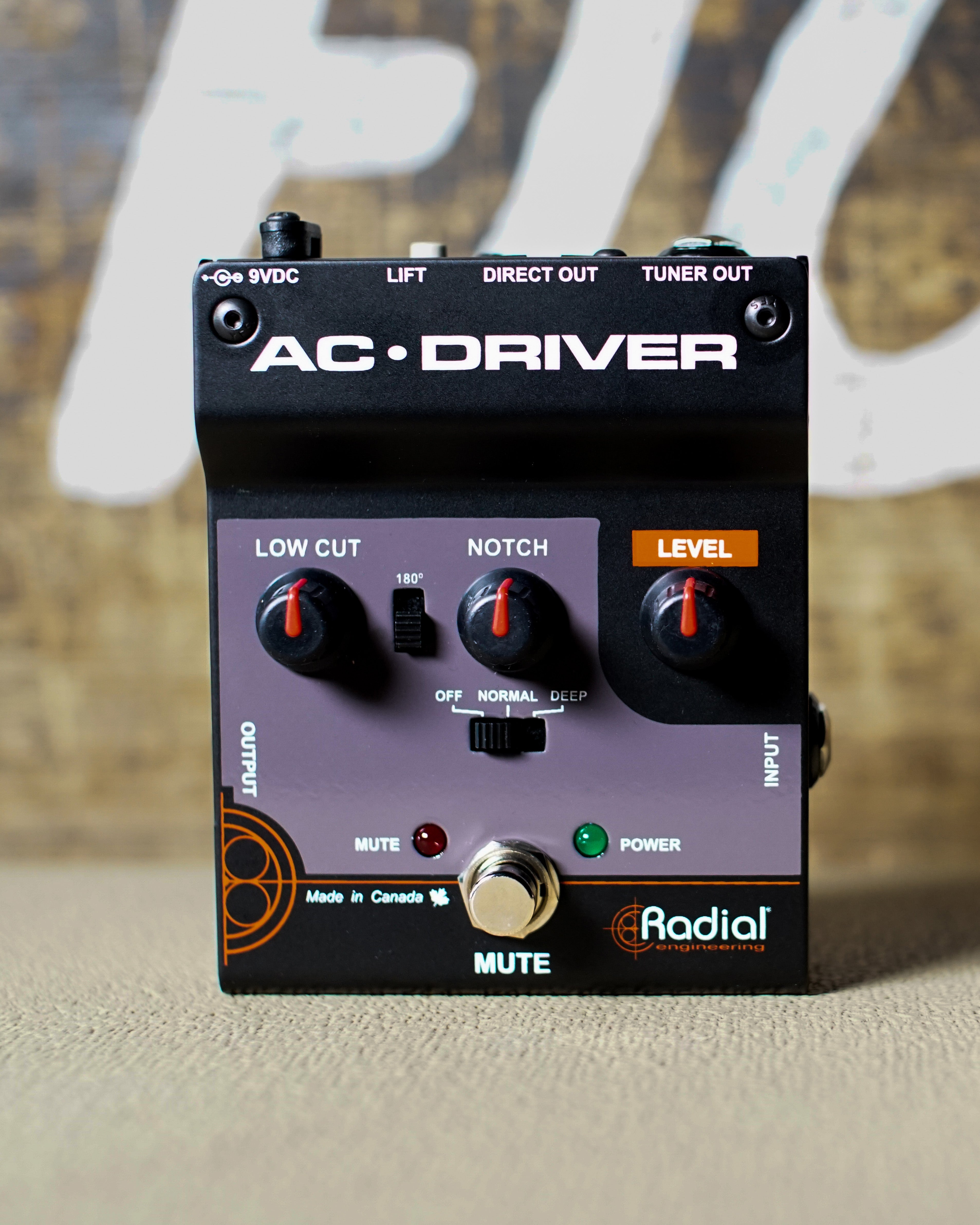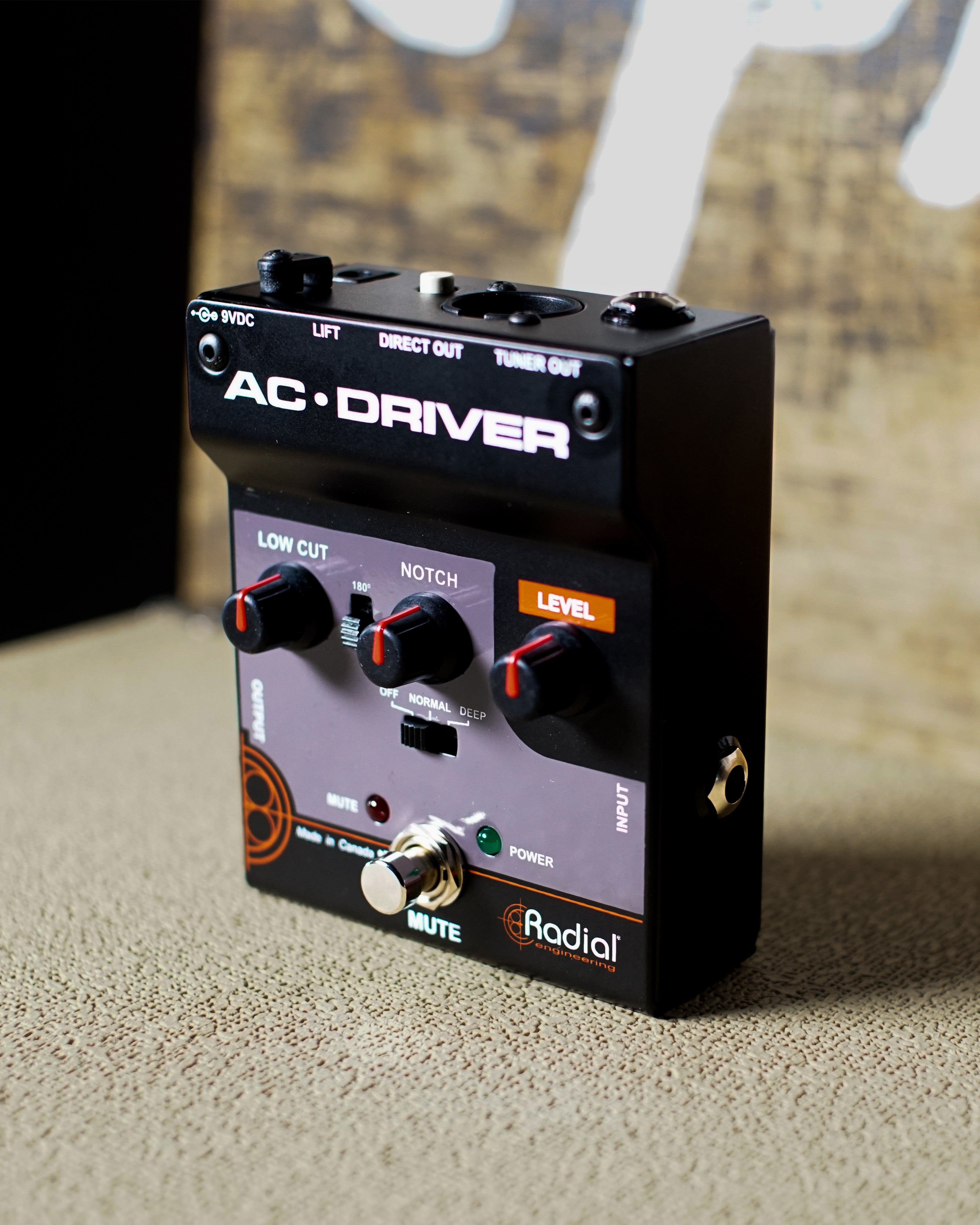The AC-Driver allows you to obtain great sounding results in a short amount of time, with powerful easy-to-use controls that allow you to set your levels and reduce on-stage feedback. An adjustable low-cut filter removes excessive low frequencies, while a 180° phase switch helps correct feedback build-up from hot spots on stage. A variable notch filter targets and removes specific problem frequencies, and a mute footswitch provides a way to silently tune on stage or change instruments without any popping or noise in the PA.