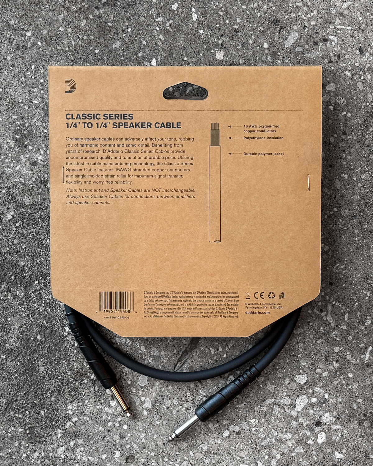 Ordinary speaker cables can adversely affect your tone, robbing you of harmonic content and sonic detail. Benefiting from years of research, high-quality D’Addario Classic Series Cables provide uncompromised quality and tone at an affordable price. Utilizing the latest in premium speaker cable manufacturing technology, the Classic Series Speaker Cable features 16AWG stranded copper conductors and single-molded strain relief for maximum signal transfer, flexibility and worry-free reliability. Note: Instrument and Speaker Cables are NOT interchangeable. Always use Speaker Cables for connections between amplifiers and speaker cabinets.