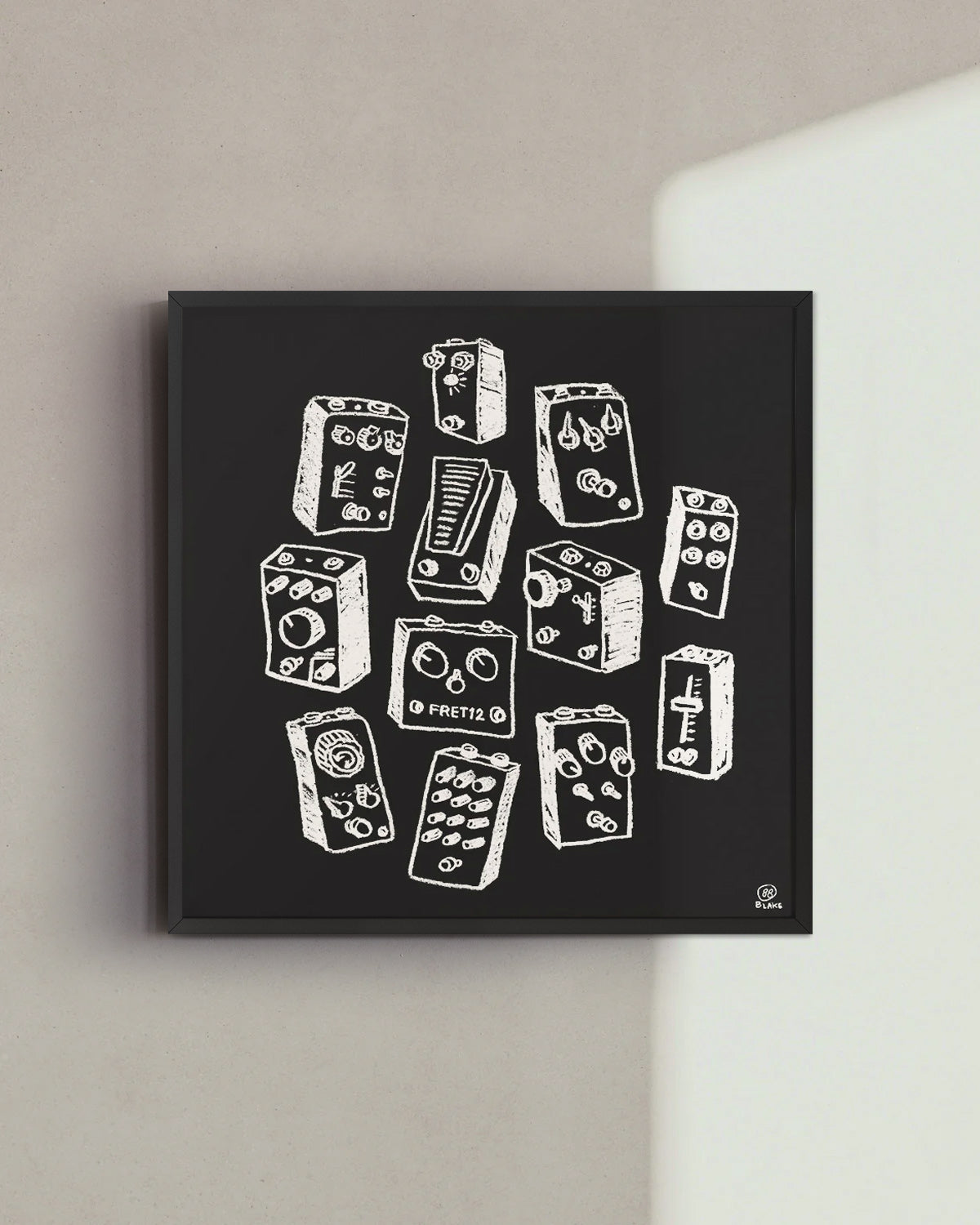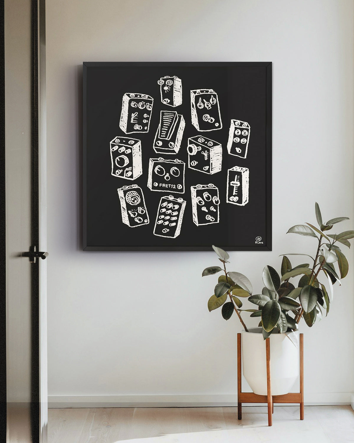 tribute to the DIY stompboxers and mad scientists who take the sounds in their head and turn it into hardware. The Pedal Junkie print is the perfect wall art to showcase your love of guitar - for the studio or home. Giclée print made and framed in the FRET12 studio on archival photo paper. Solid wood frame proudly made in USA. Hand signed by the artist.