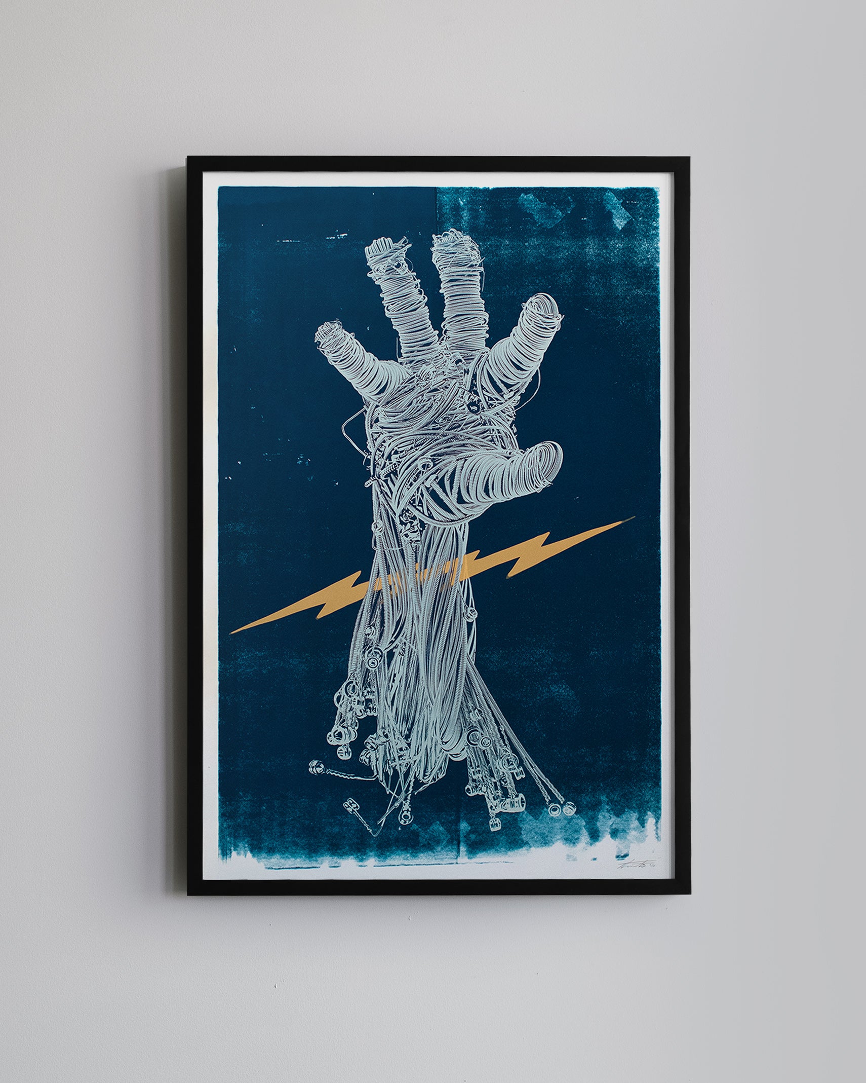 The Picking Hand in Indigo is a limited-edition series of 15 prints hand silk-screened by artist Daniel Tremonti. Drawing inspiration from the weathered patina and industrial essence of discarded guitar strings, Tremonti breathes new life into his mummified embodiments of music.