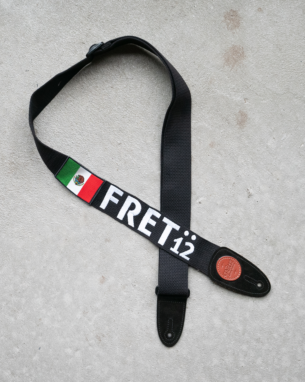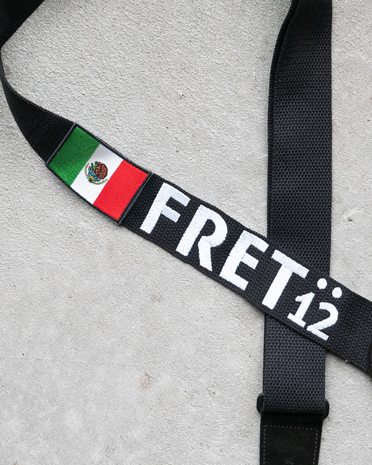 Embroidered FRET12 Block Logo Guitar Strap in black, with a woven Mexico Flag badge.
