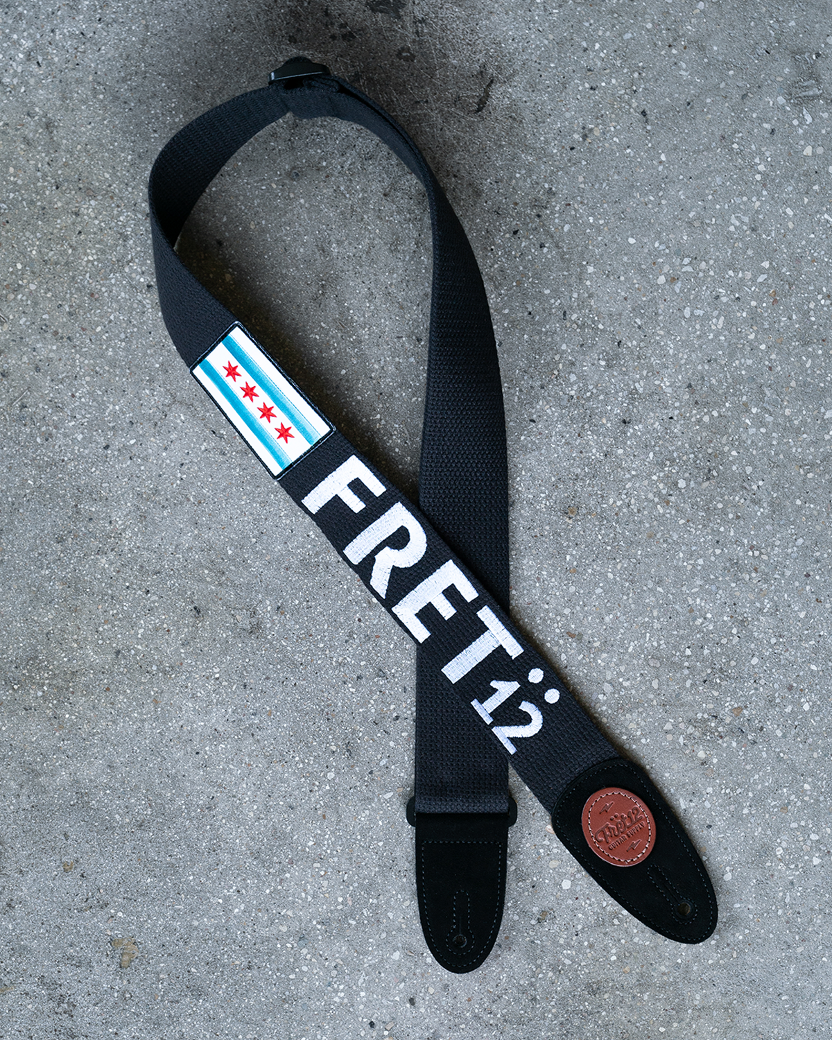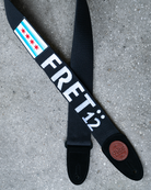 Embroidered FRET12 Block Logo Guitar Strap in black, with a woven Chicago Flag badge.