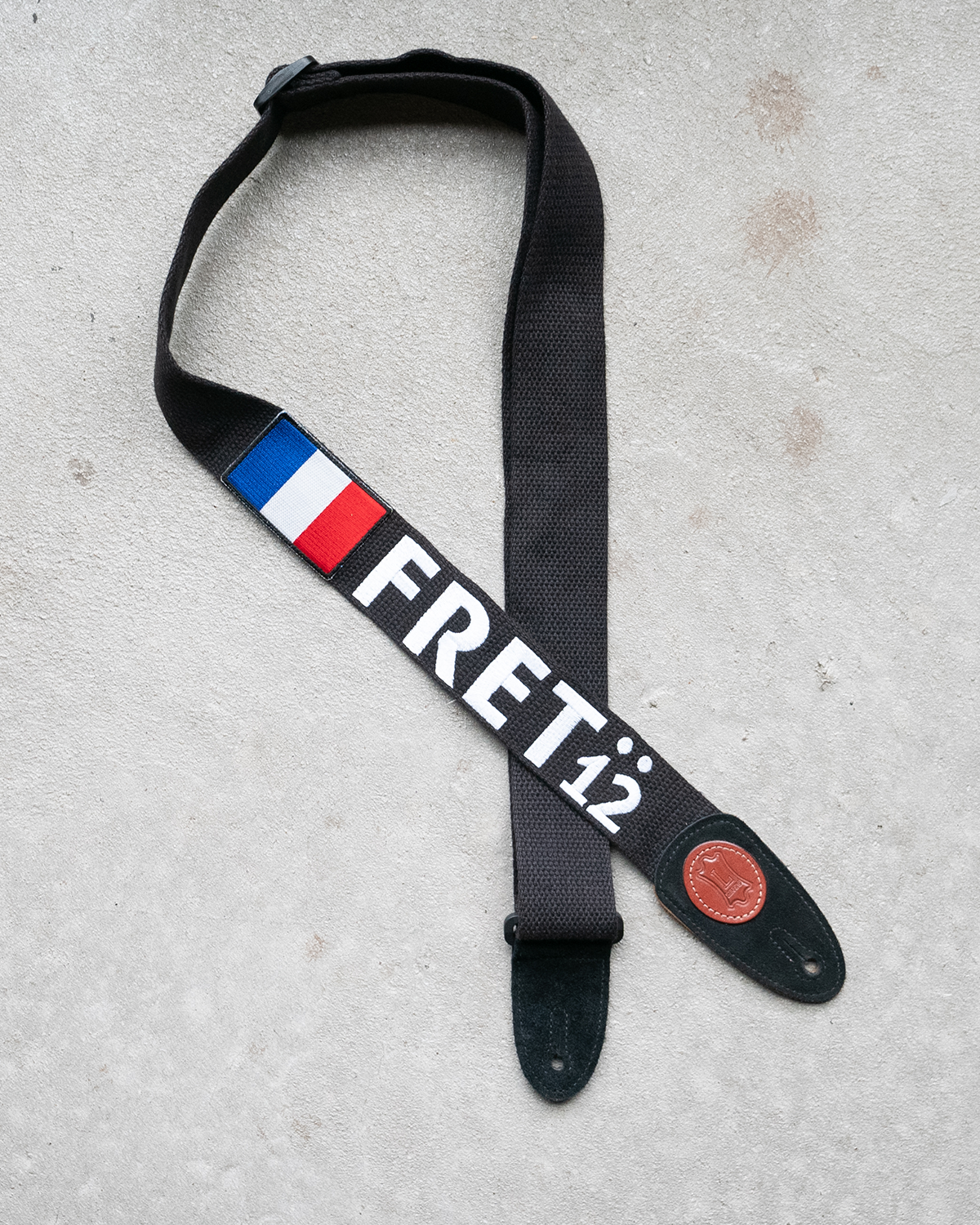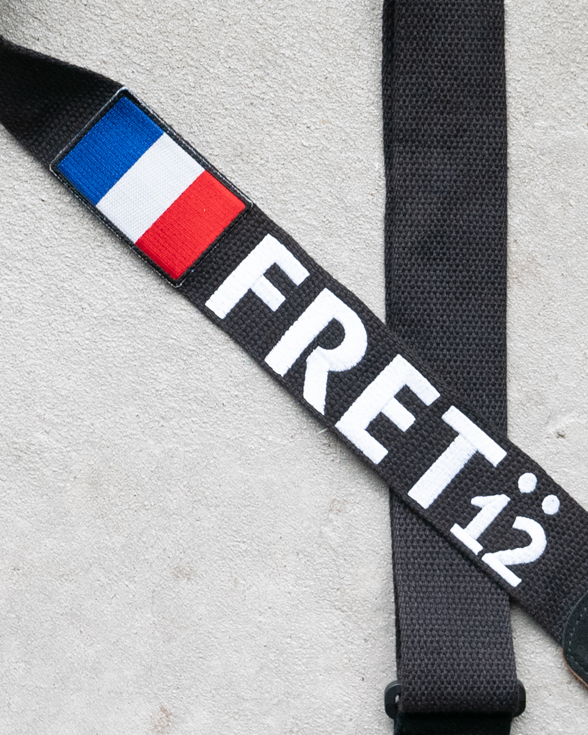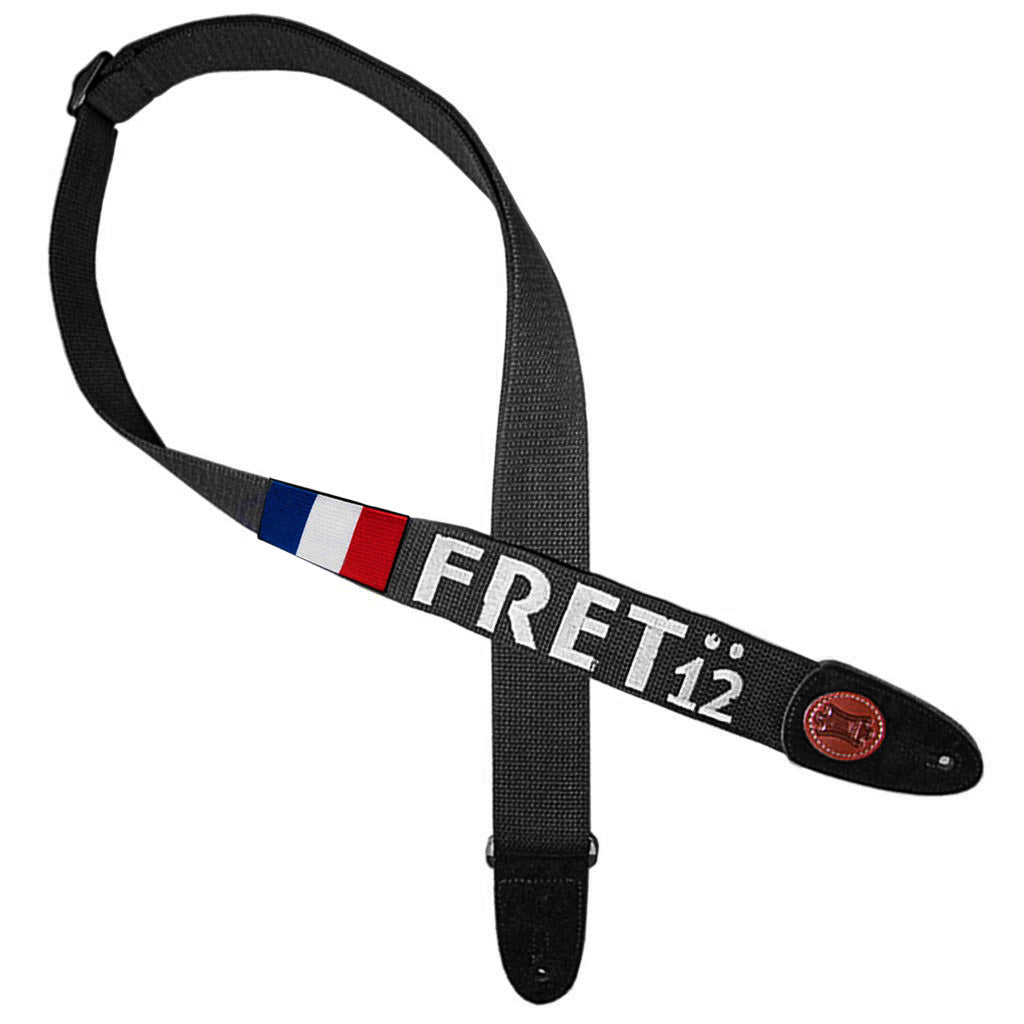 Embroidered FRET12 Block Logo Guitar Strap in black, with a woven France Flag badge.