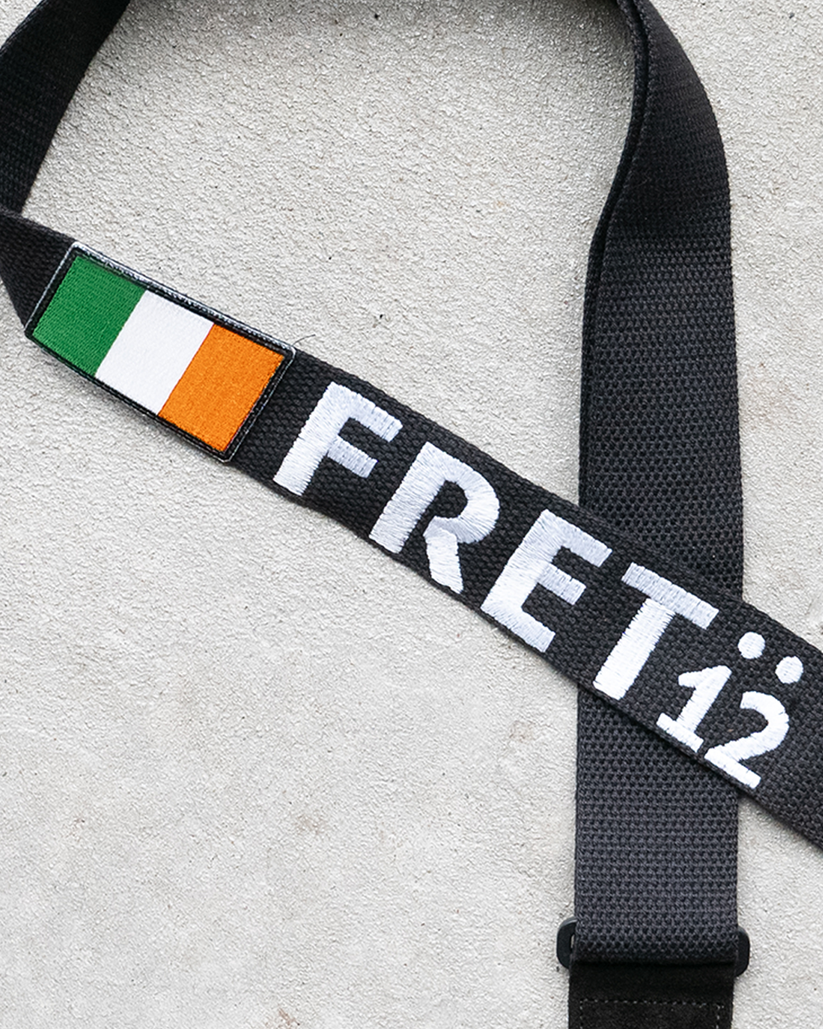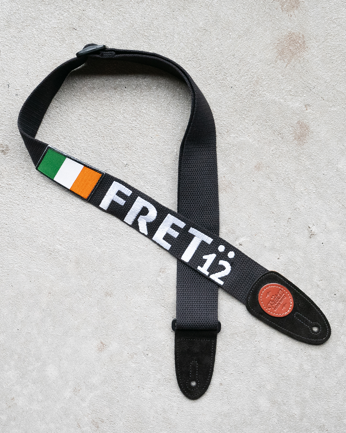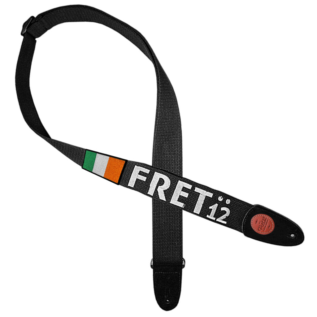 Embroidered FRET12 Script Logo Guitar Strap in black, with a woven Ireland (Éire) Flag badge.
