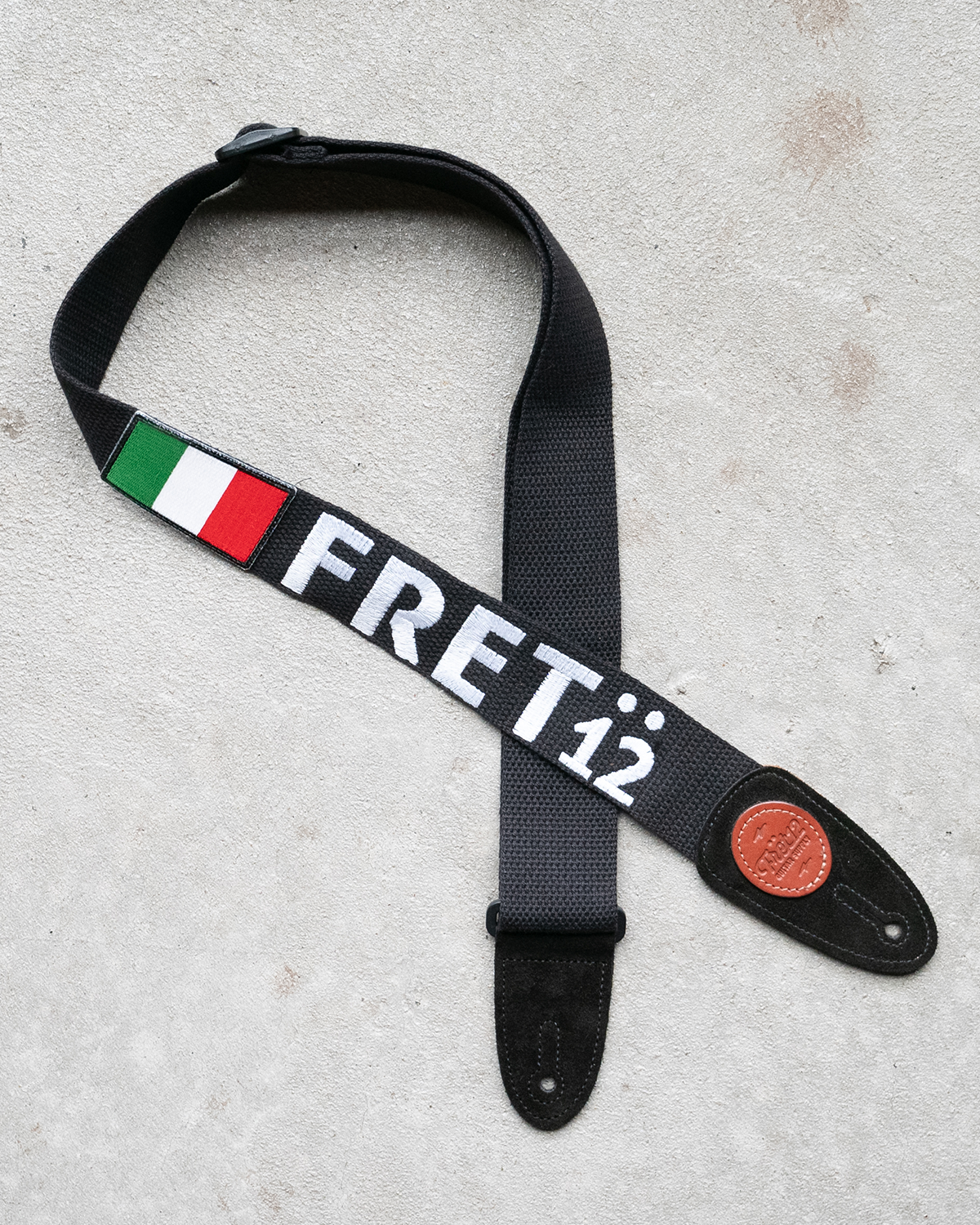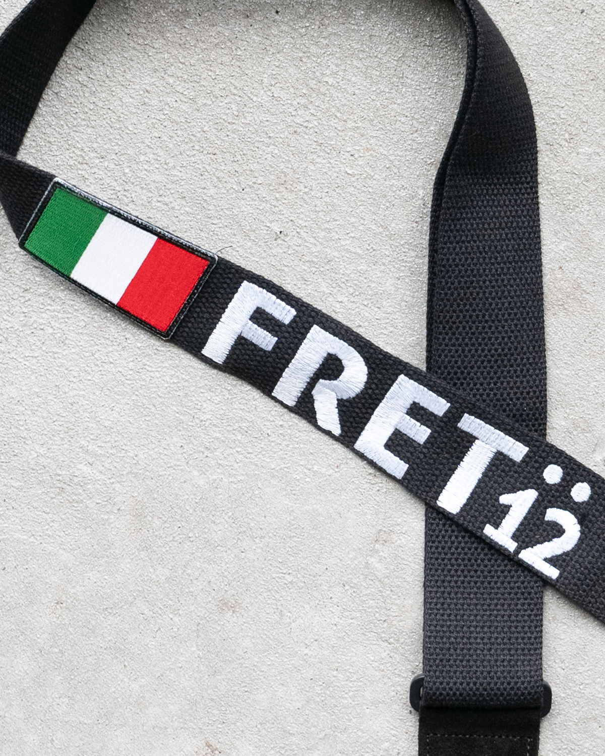 Embroidered FRET12 Block Logo Guitar Strap in black, with a woven Italy (Italia) Flag badge.