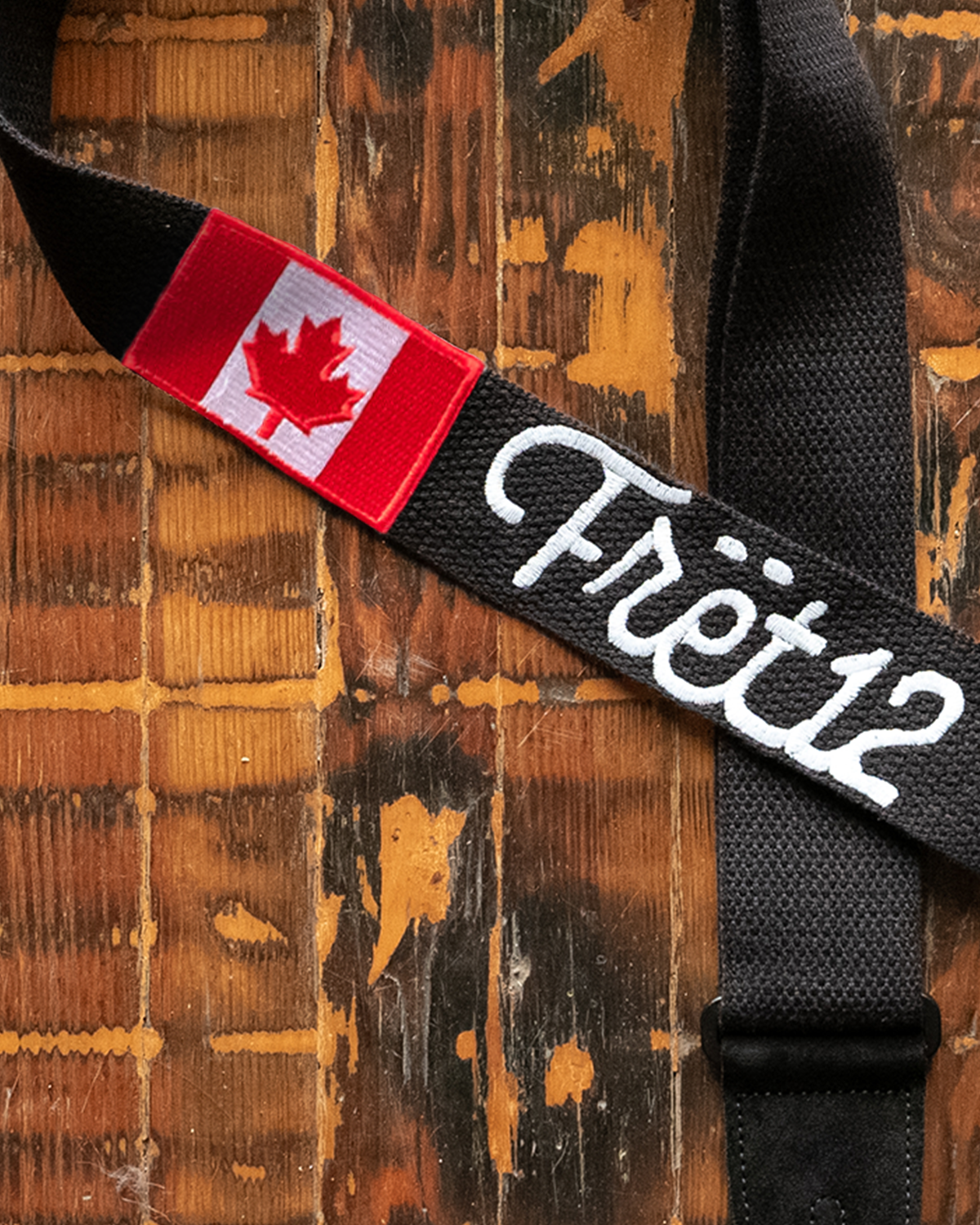 Embroidered FRET12 Script Logo Guitar Strap in black, with a woven Canadian Flag badge.