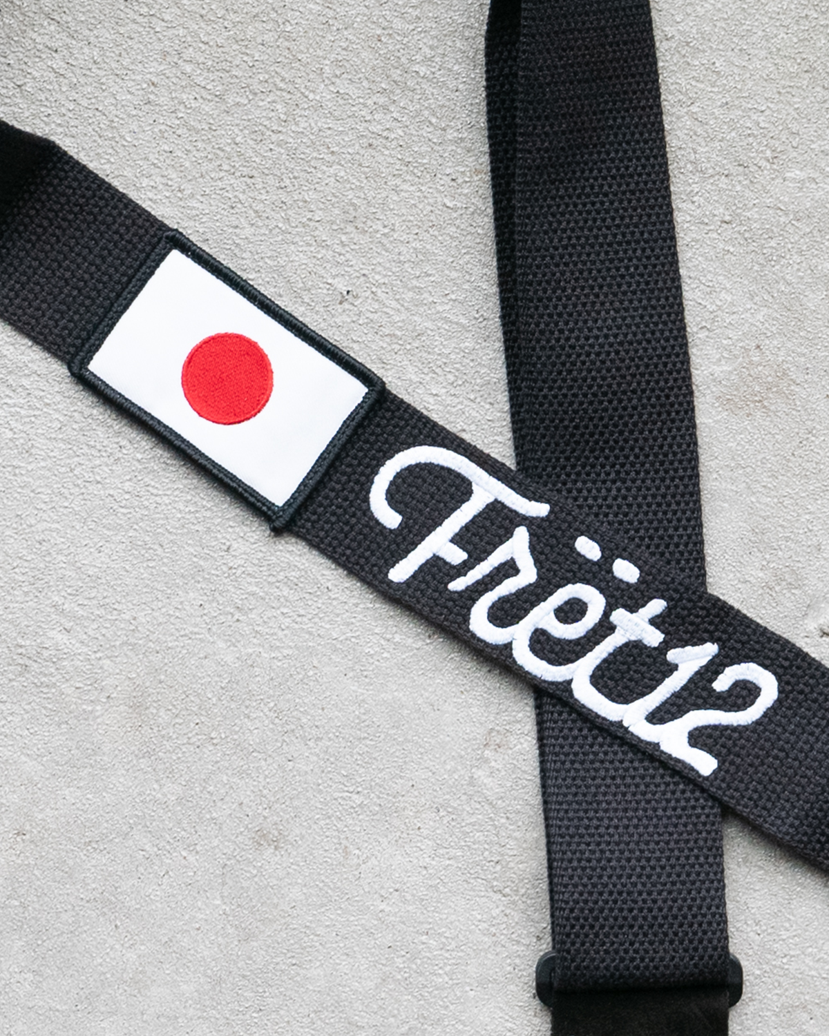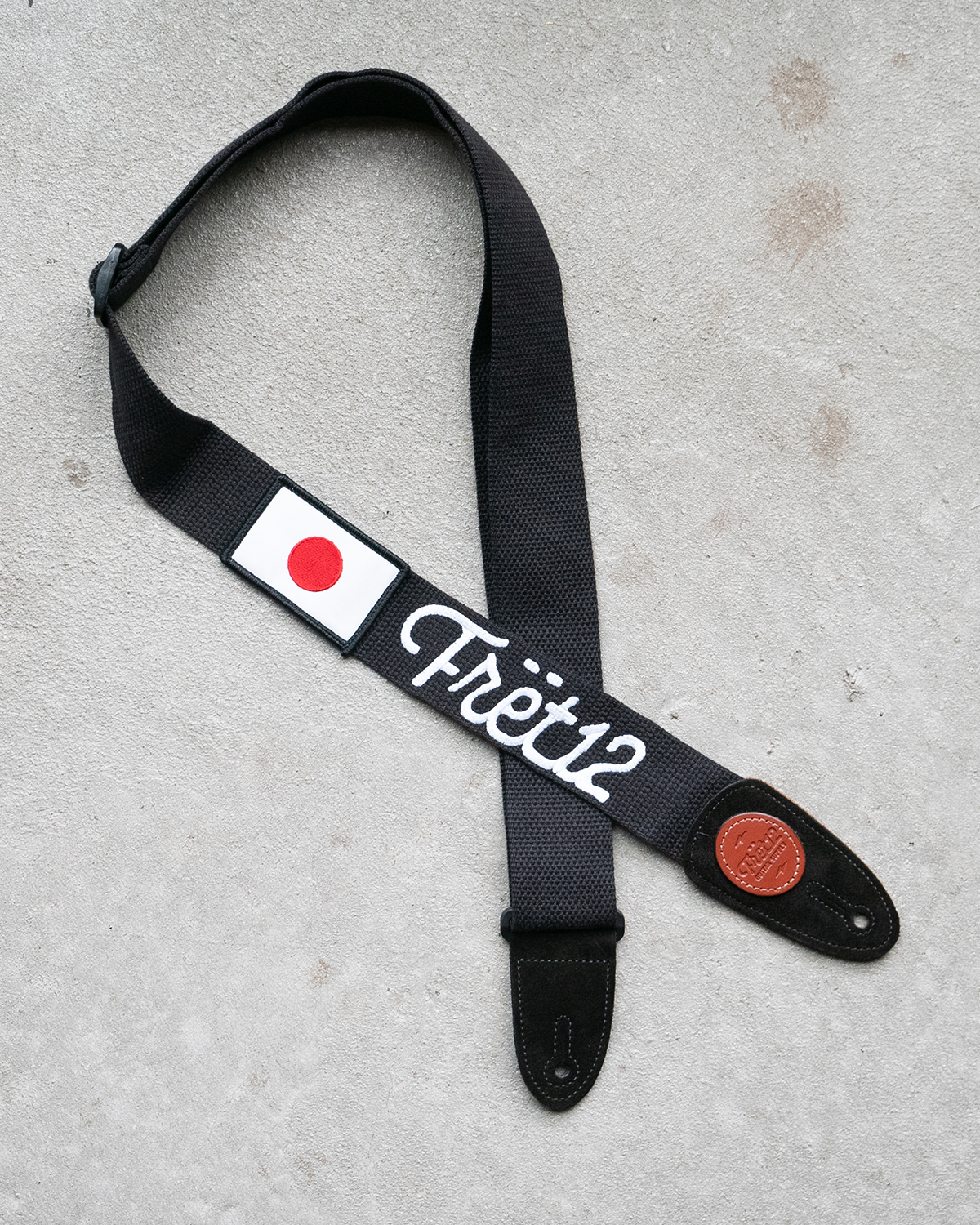Embroidered FRET12 Script Logo Guitar Strap in black, with a woven Japan (日本) Flag badge.