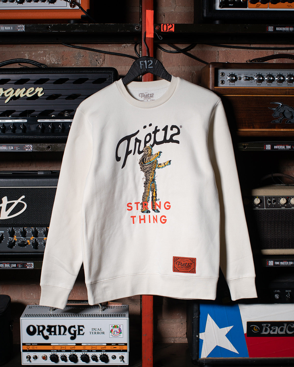 Behold, the return of the String Thing: from the depths of the underground scene, from the wildest pits of the darkest basement shows, he rises to grace this scary-good new horror-inspired crewneck.