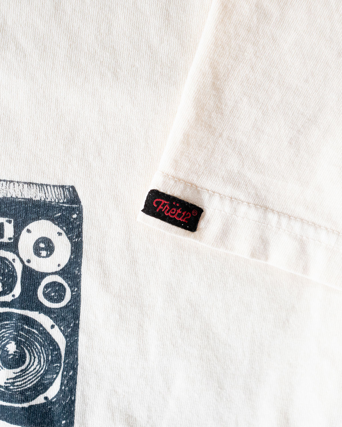 The final touch: a hand-sewn FRET12 sleeve tag, added in our studio.